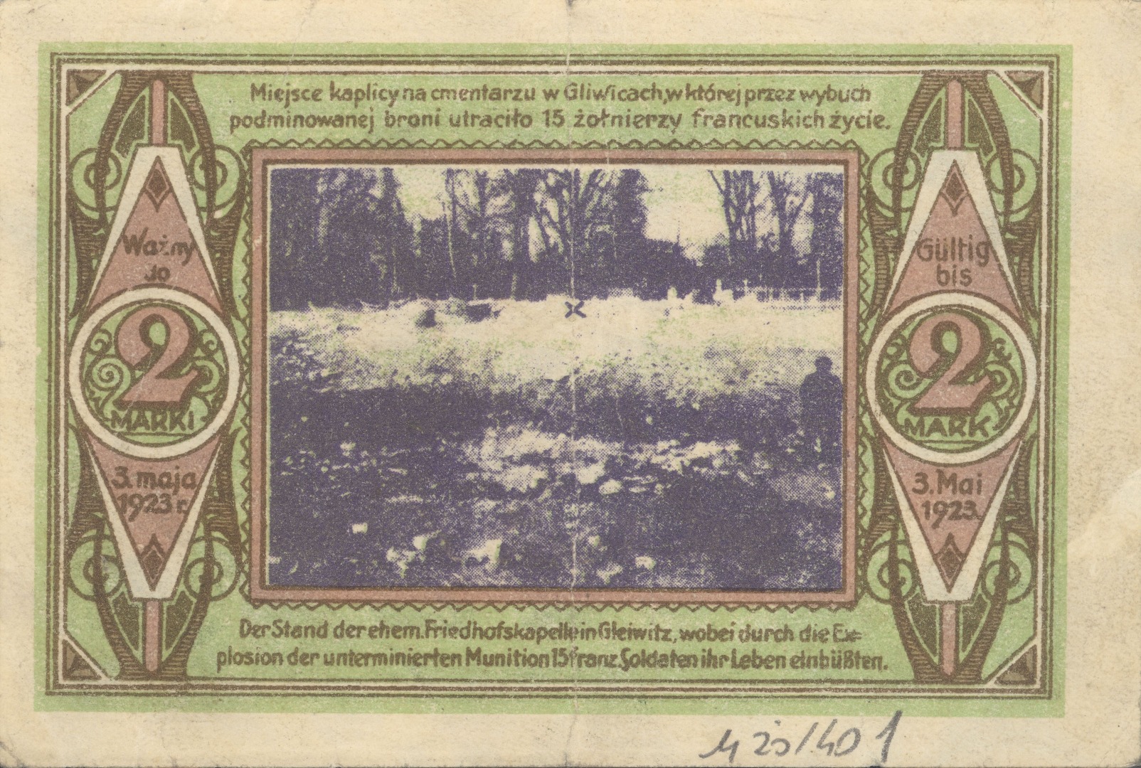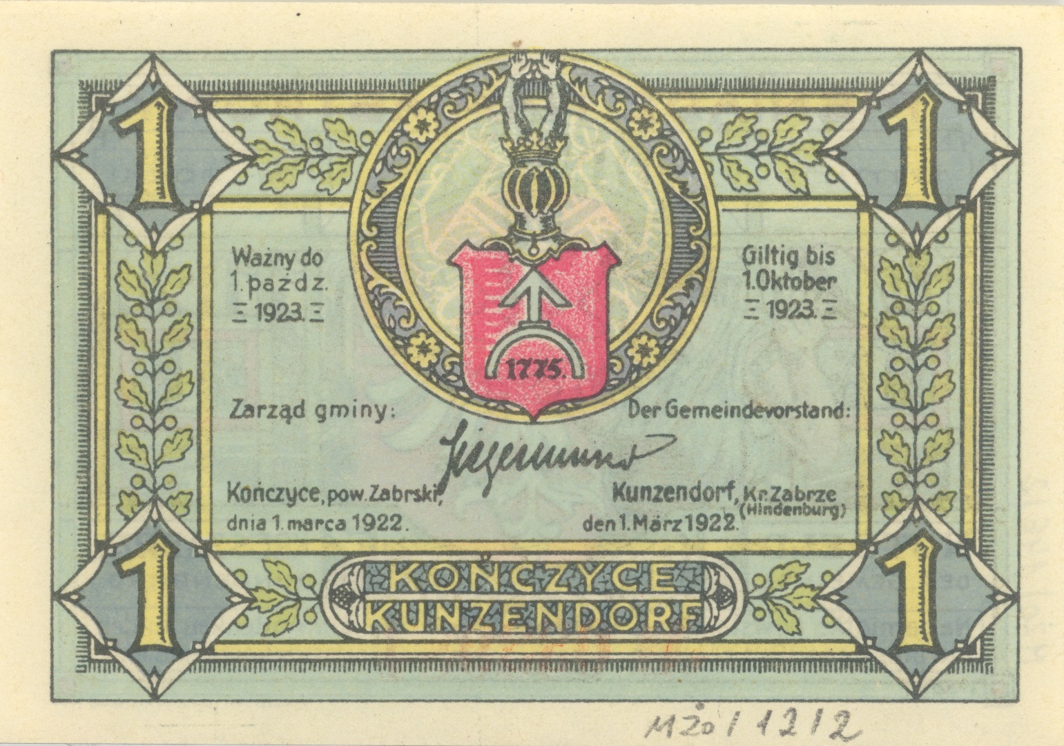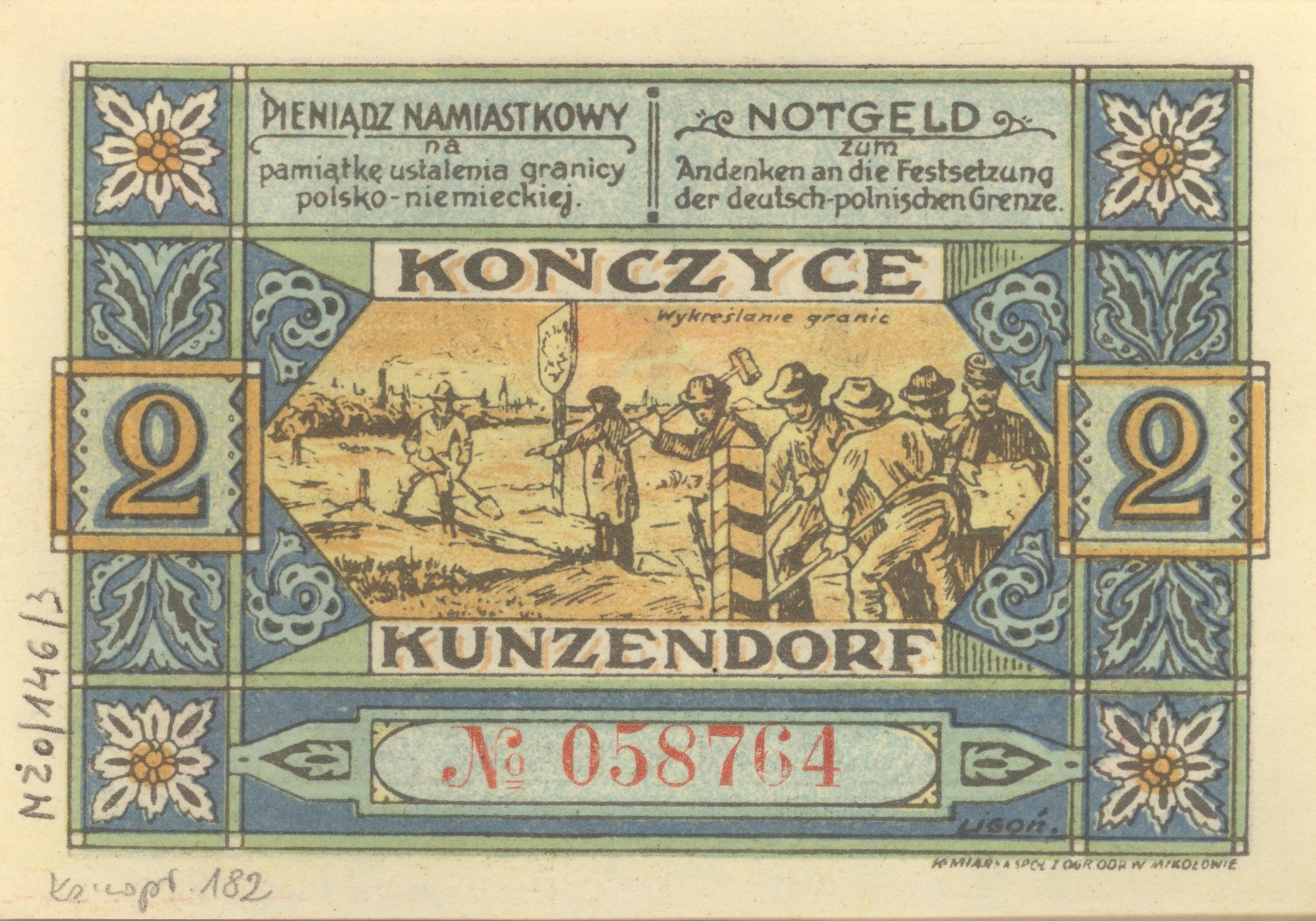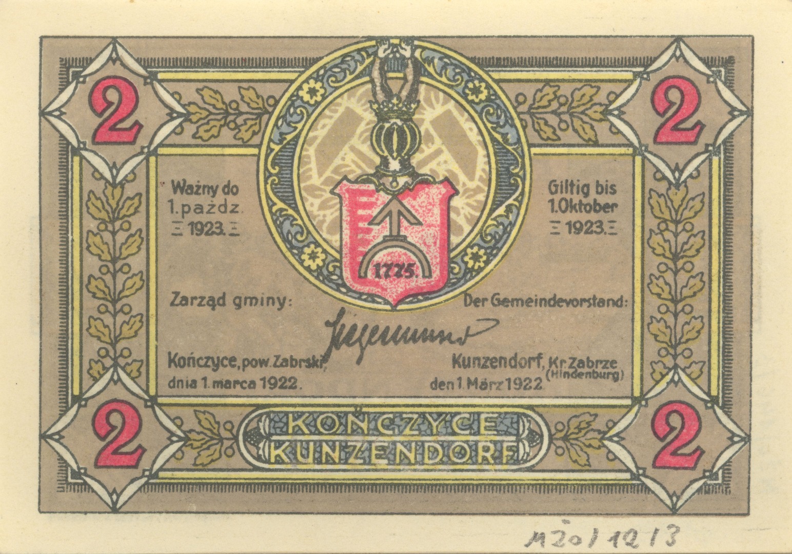 Banknot zastępczy o nominale 2 marek wydany 1.03.1922 r. przez gminę Kończyce (powiat Zabrski) na pamiątkę ustalenia granicy polsko-niemieckiej. Ważny do 1.10.1923 roku.