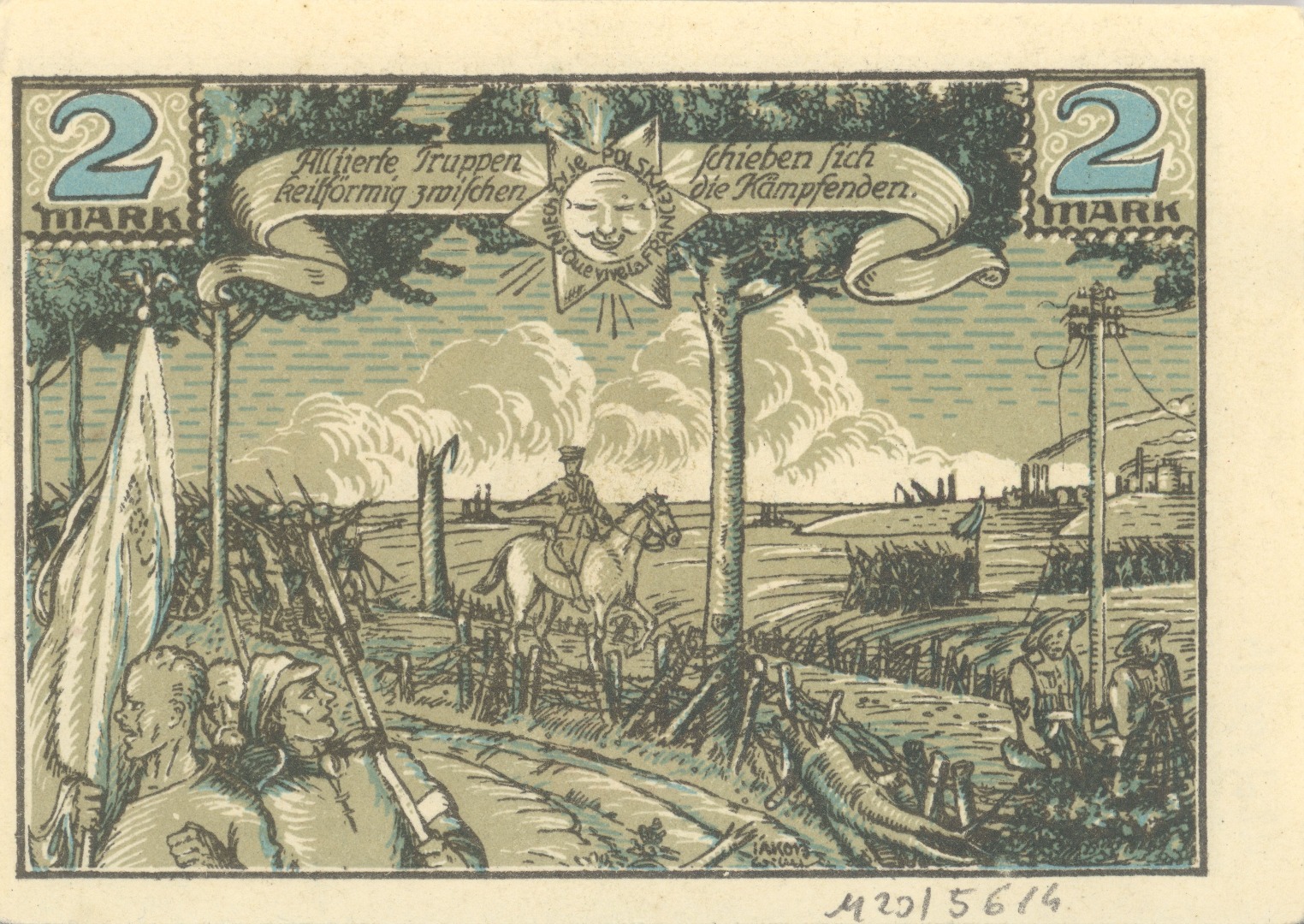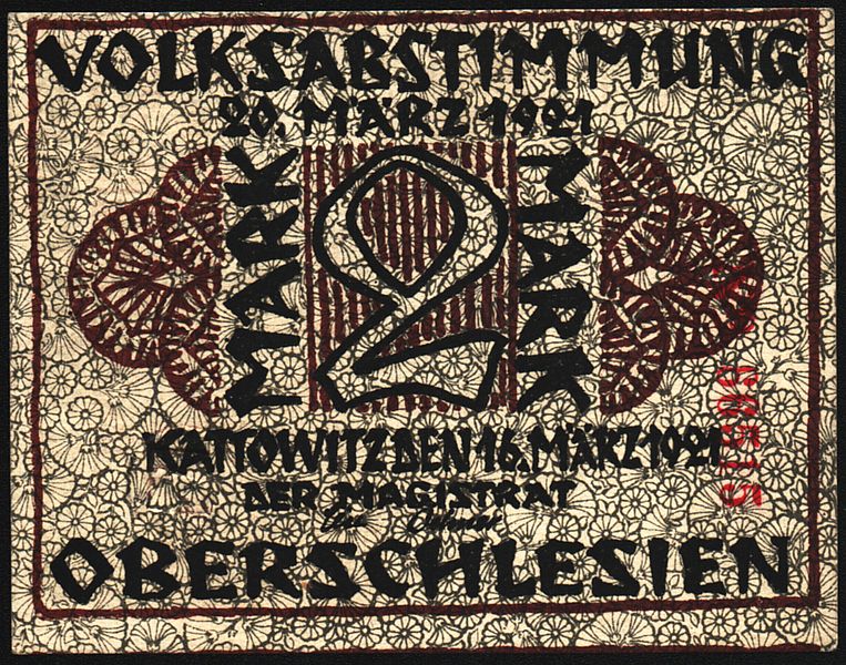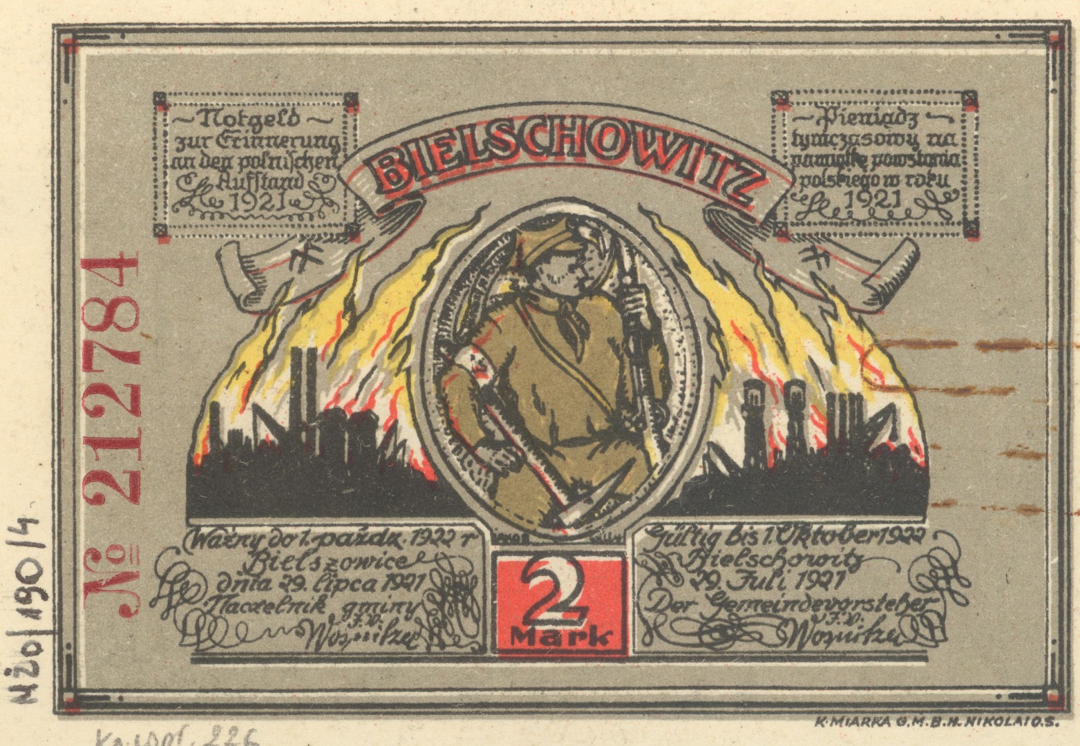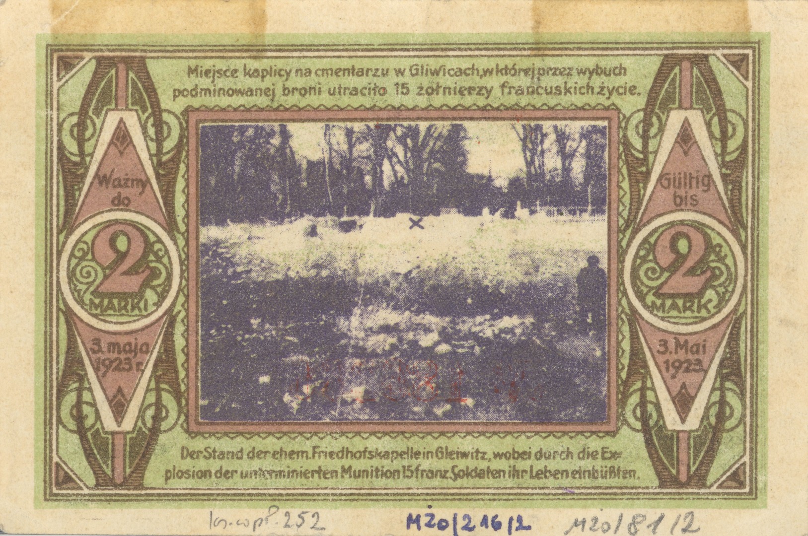 Banknot zastępczy o nominale 2 marek wydany 1.03.1922 r. przez gminę Kończyce (powiat Zabrski) na pamiątkę ustalenia granicy polsko-niemieckiej. Ważny do 1.10.1923 roku.