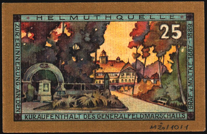 Na awersie w górnej części napis: Bad Kudowa, poniżej rysunek przedstawiający postać siedzącej kobiety, poniżej napis: Erstes Herz u. Nerven Heilbad des Ostens, po bokach symbol nominału 25 pf., w lewym dolnym rogu numer seryjny. Na rewersie znajduje się źródło Helmuta w parku zdrojowym, powyżej napis: Helmuthquelle. W ramce napis wspominający pobyt Marszałka Polnego von Moltke w uzdrowisku: zur Erinnerung an den Kuraufenthalt des Generalfeldmarschalls Graf v. Moltke 1887-1889.