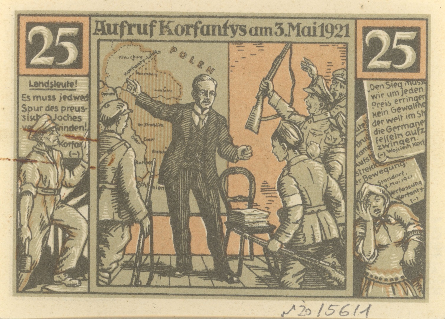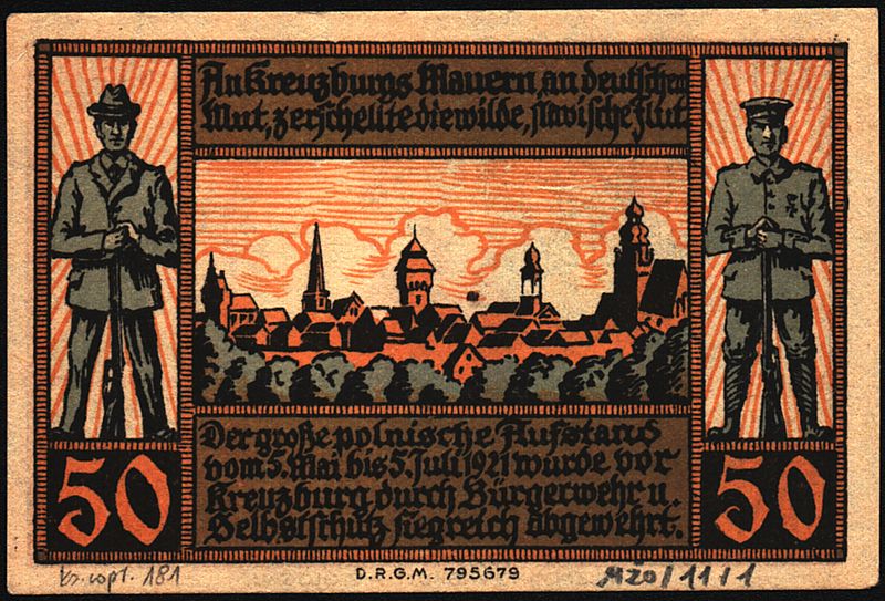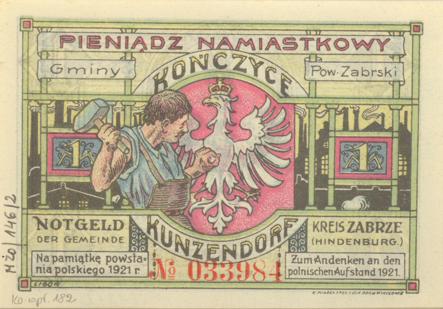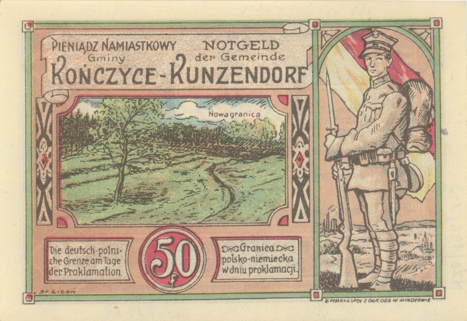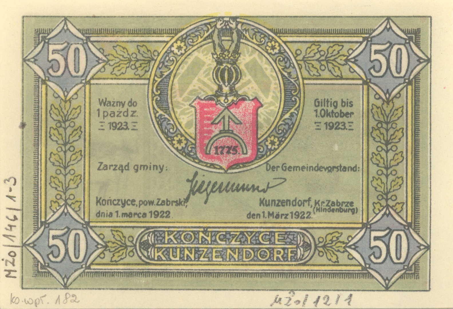 Banknot zastępczy o nominale 50 fenigów wydany przez gminę Kończyce (powiat Zabrski) w dniu 1.03.1922 roku. Ważny do dnia 1.10.1923 roku. Na awersie przedstawiony jest rysunek z nową granicą polsko-niemiecką w dniu proklamacji oraz żołnierz wojska polskiego w pełnym umundurowaniu.