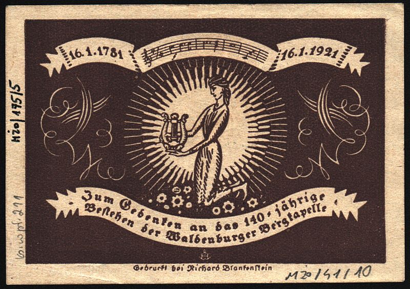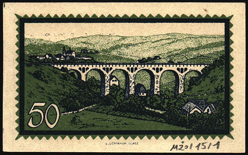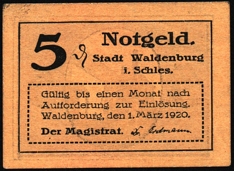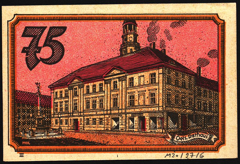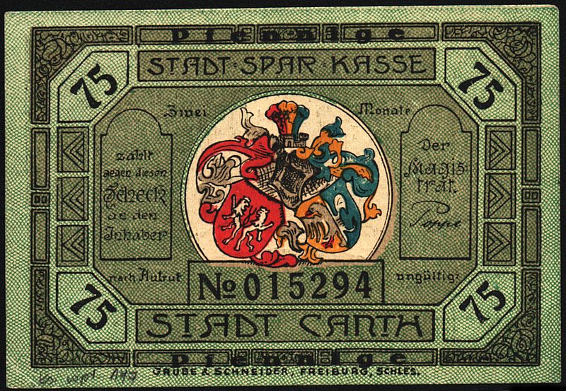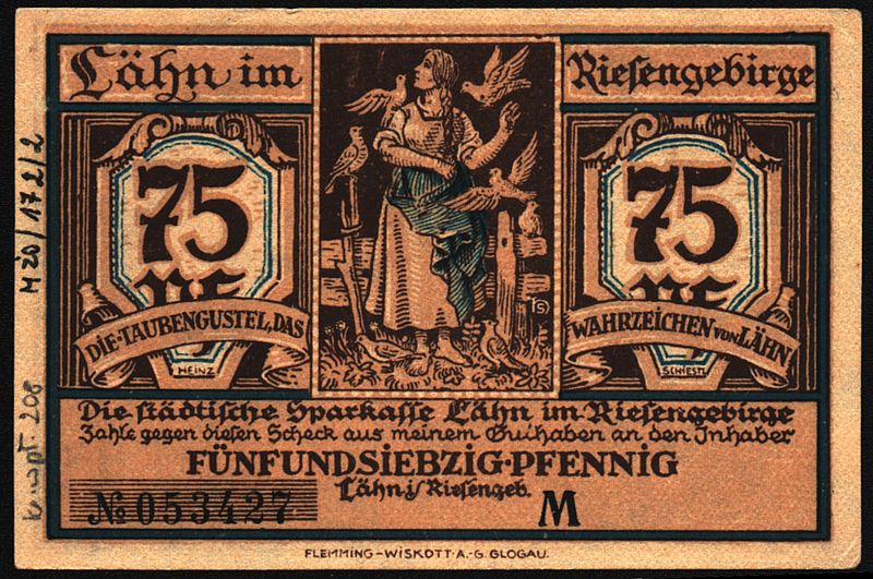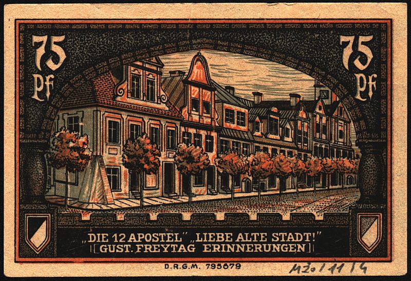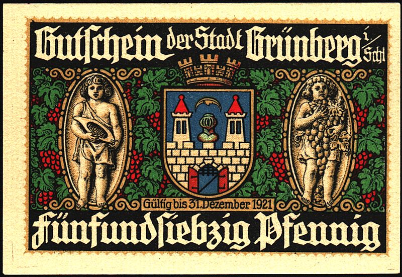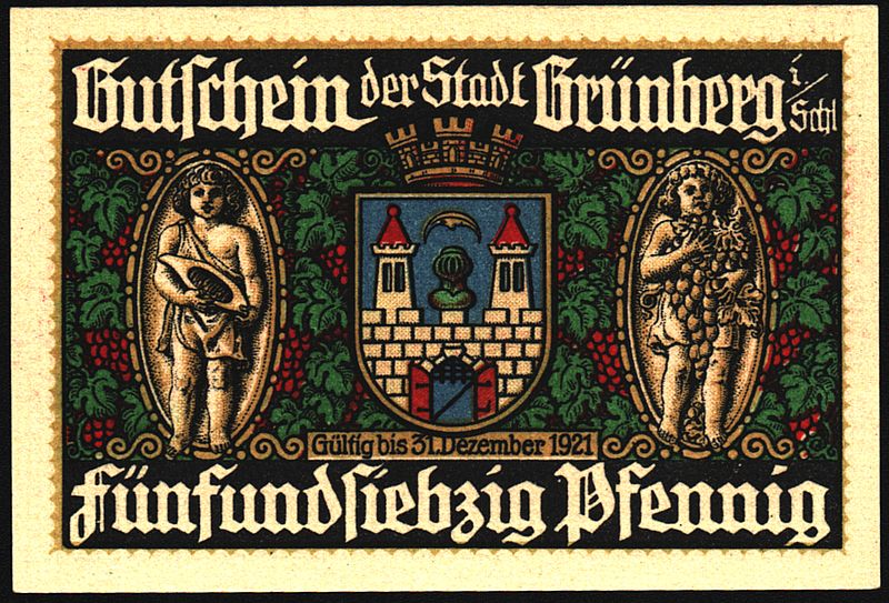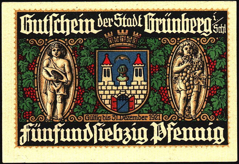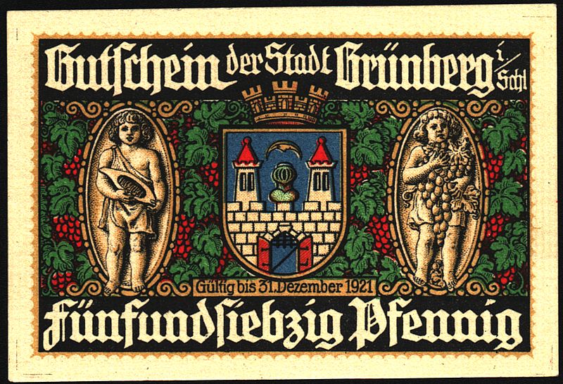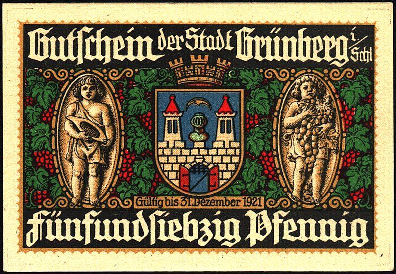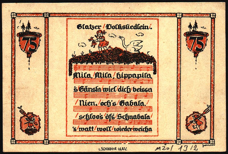 Na określenie pieniędzy namiastkowych używano także terminu „kupony”. Na awersie w górnej części napis: Gutschein, poniżej miniatura panoramy miasta i napis: der Stadt Glatz, Grafschaft Glatz, Gűltig bis zum 31 Dezember 1921, Der Magistrat. Nieczytelne podpisy. W górnych rogach symbol nominału 75 pf. Na rewersie w środkowej części zapis nutowy pieśni ludowej i napis: Glatzer Volksliedlein. Po obu bokach symbol nominału 75 pf.
