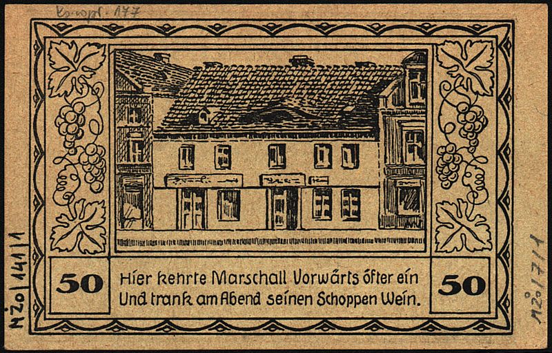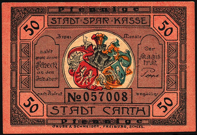 Na awersie napis: Stadt Spar Kasse Stadt Canth (Miejska Kasa Oszczędnościowa, Miasto Kąty Wrocławskie), w centralnej części herb miasta, w rogach symbole nominałów 50. W centralnej części rewersu rycina przedstawiająca budynek, pod spodem napis: Hier kehrte Marschall Vorwärts öfter ein Und tran kam Abend seinen Schoppen Wein. Po bokach roślinne elementy dekoracyjne, w dolnych rogach symbole nominałów 50. Całość otoczona ramką z ornamentem.