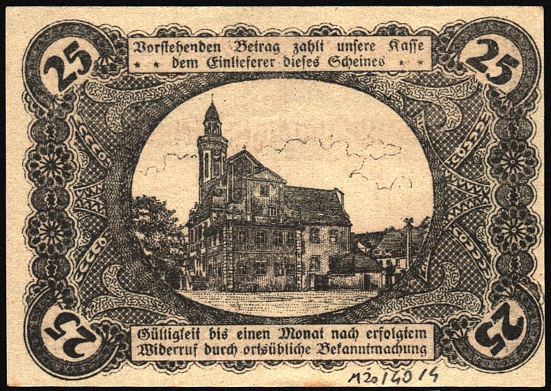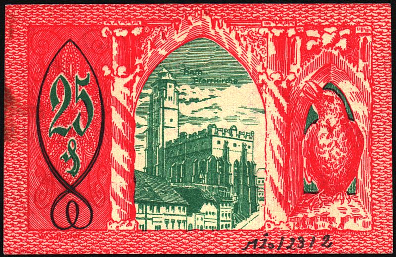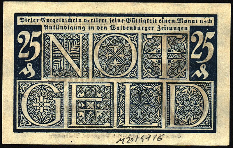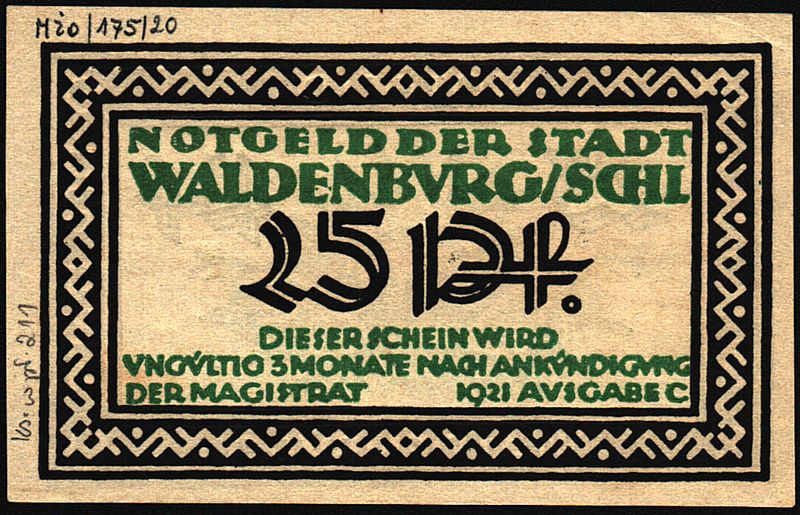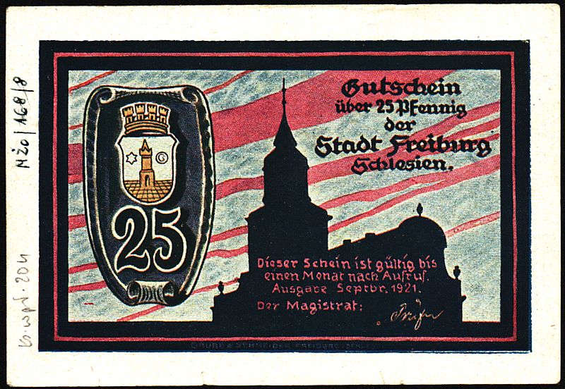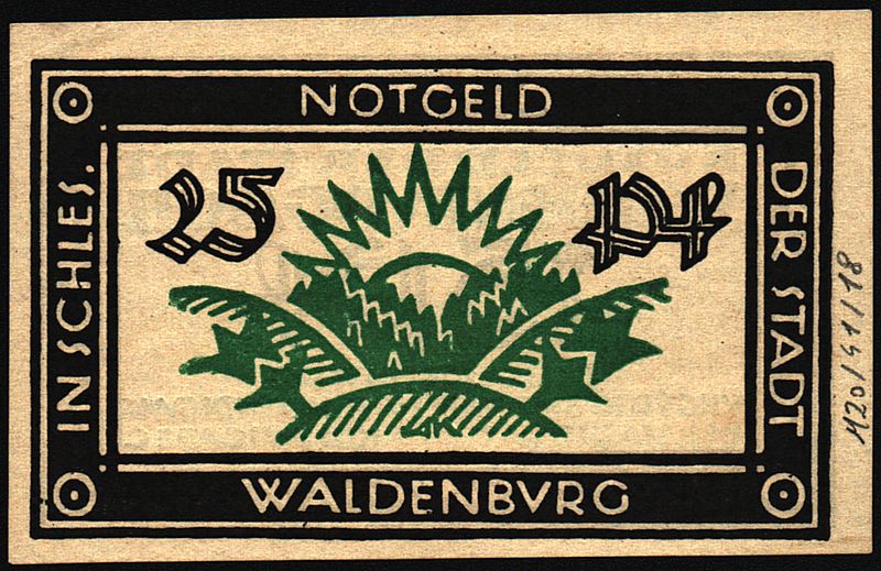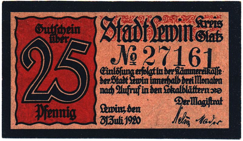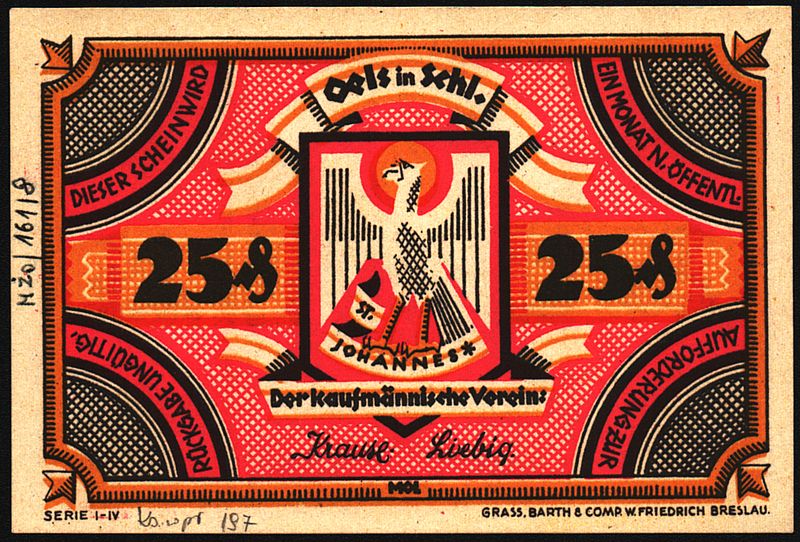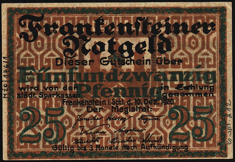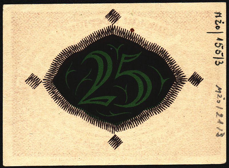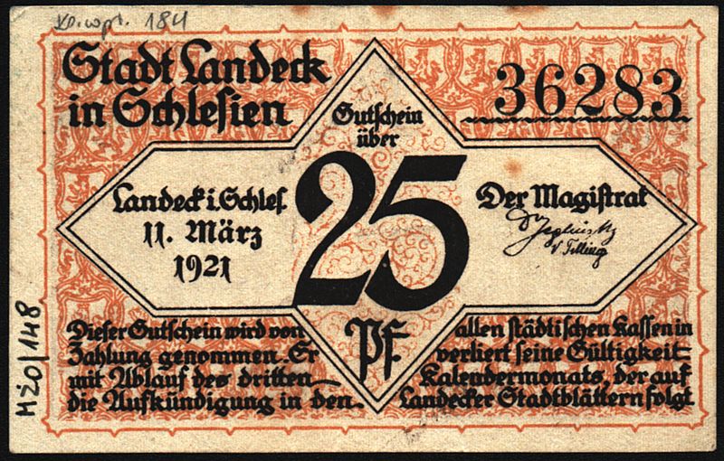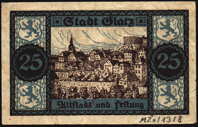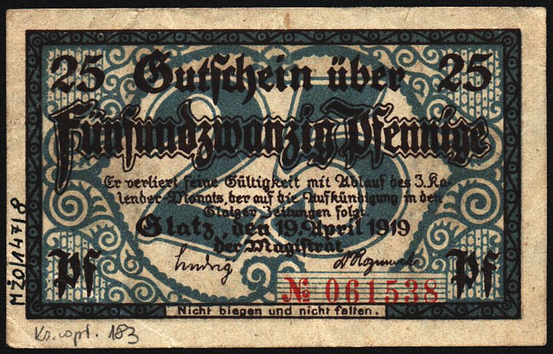 Na określenie pieniędzy namiastkowych używano także terminu „kupony”. Na awersie w górnej części napis: Gutschein űber Fűnfundzwanzig Pfennige, w górnych rogach symbole nominału 25. Na dole numer seryjny. W dolnej części ramki napis: Nicht blagen und nicht fallen. Na rewersie w środkowej części ilustracja przedstawiająca widok na miasto, powyżej napis: Stadt Glatz, poniżej napis: Altstadt und Festung. Po bokach symbole nominału 25.