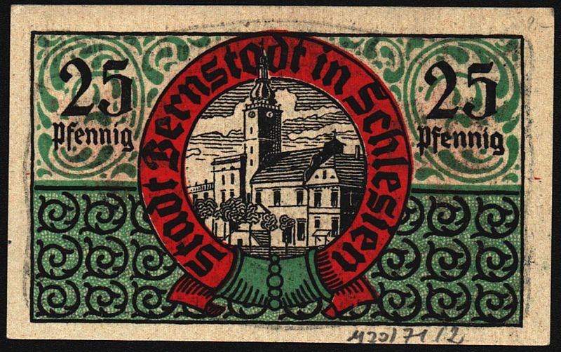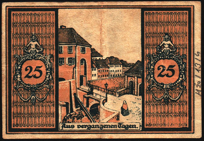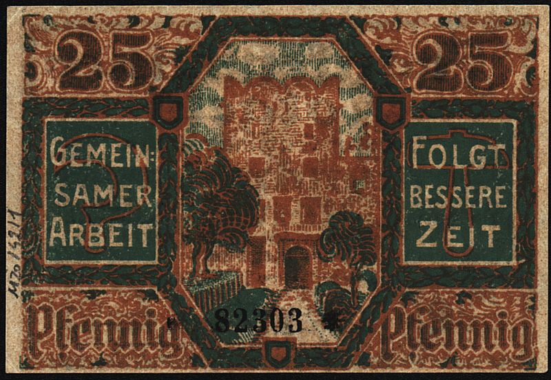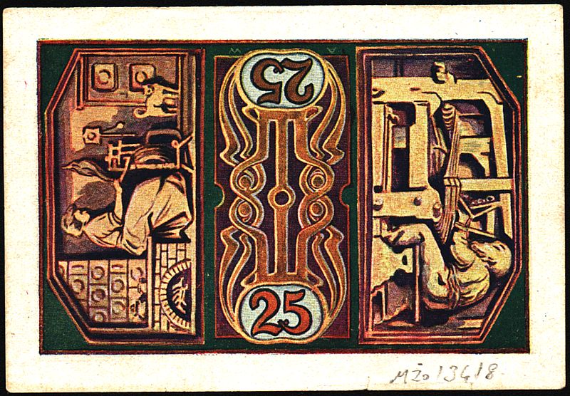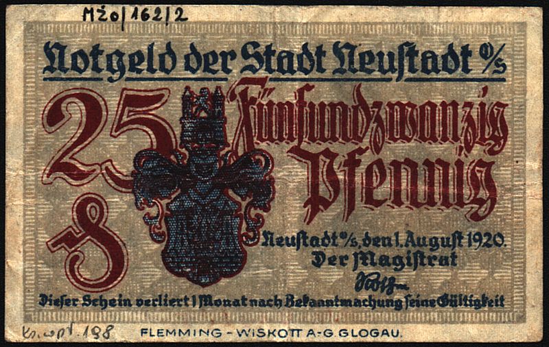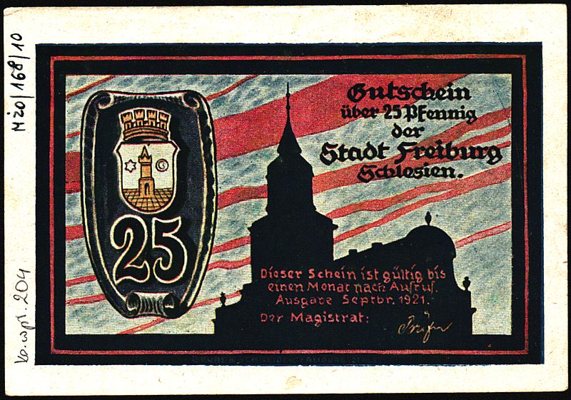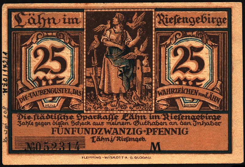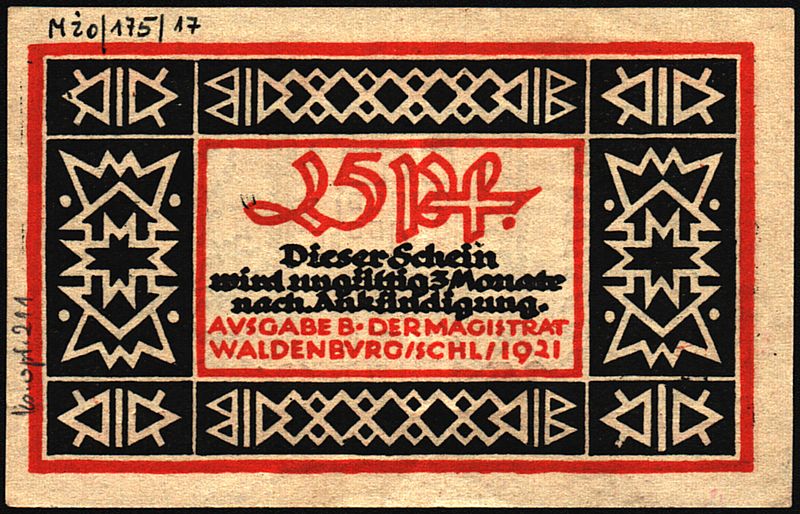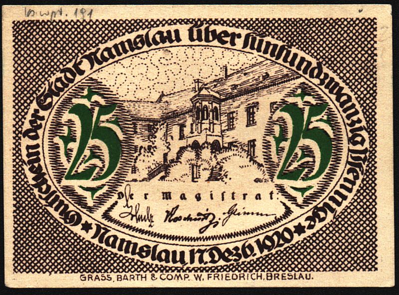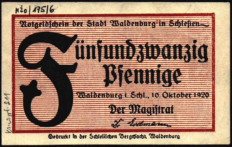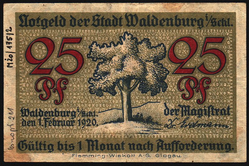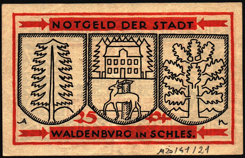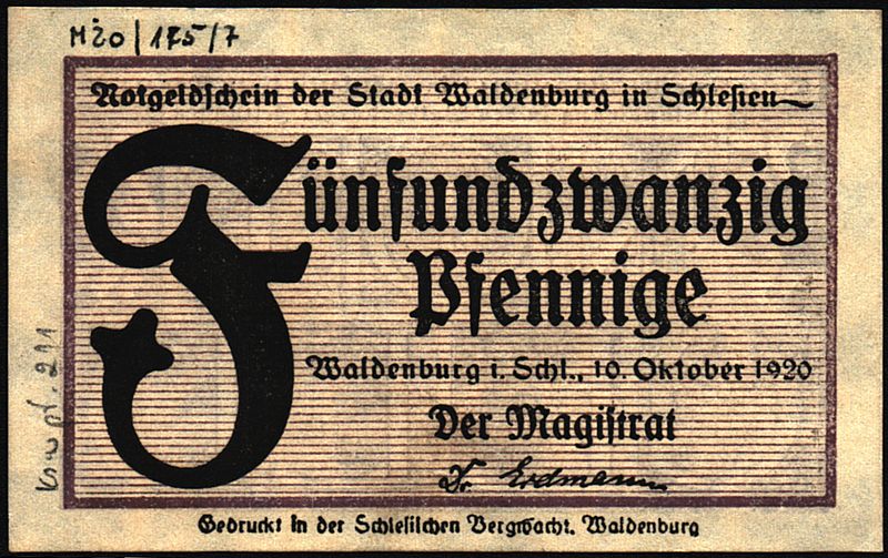 Na określenie pieniędzy namiastkowych używano także terminu „kupony”. Na awersie w górnej części napis: Gutschein űber Fűnfundzwanzig Pfennige, w górnych rogach symbole nominału 25. Na dole numer seryjny. W dolnej części ramki napis: Nicht blagen und nicht fallen. Na rewersie w środkowej części ilustracja przedstawiająca widok na miasto, powyżej napis: Stadt Glatz, poniżej napis: Altstadt und Festung. Po bokach symbole nominału 25.