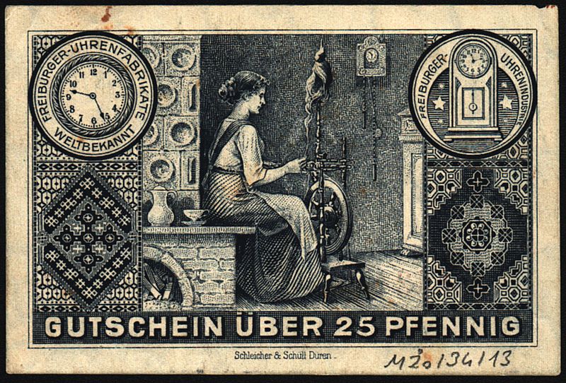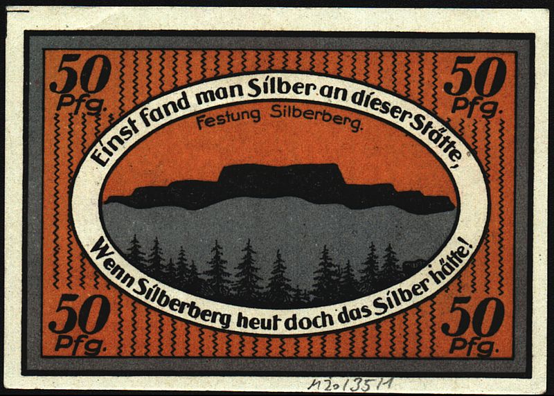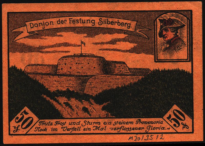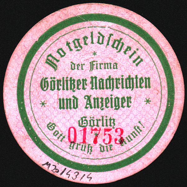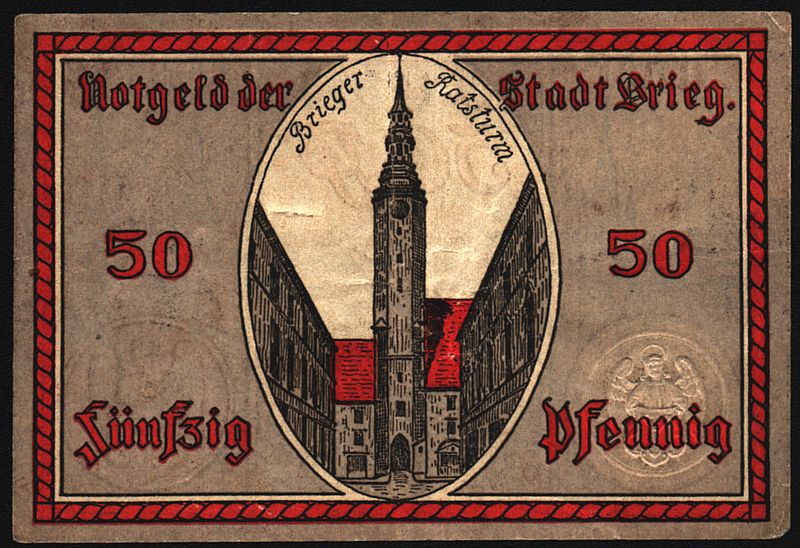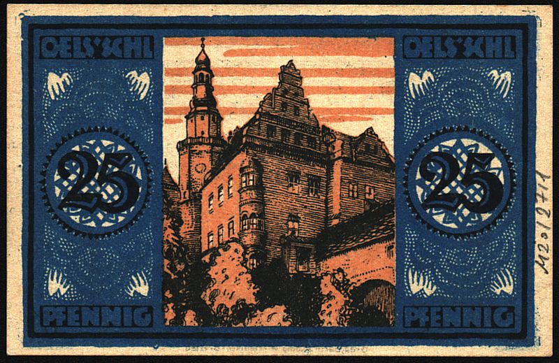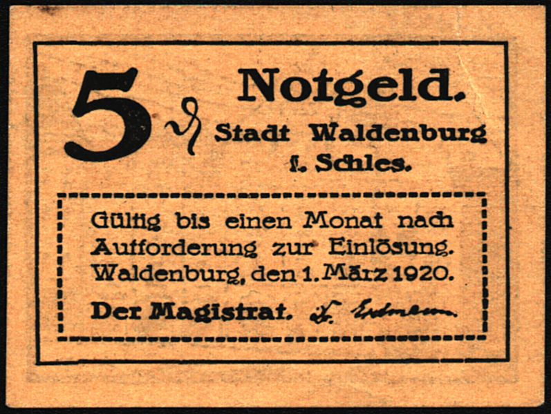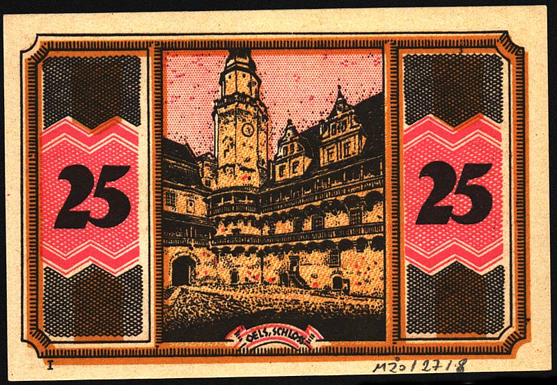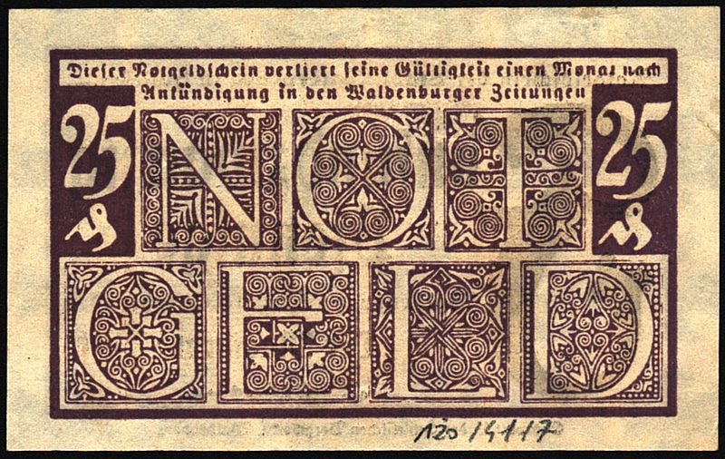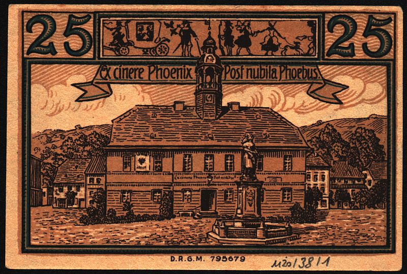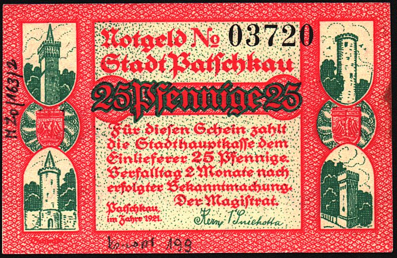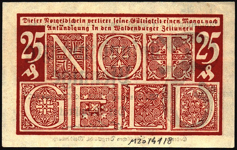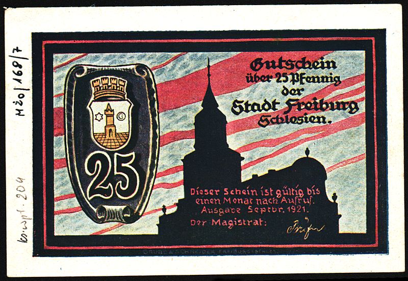 Na określenie pieniędzy namiastkowych używano także terminu „kupony”. Na awersie w górnej części napis: Gutschein űber Fűnfundzwanzig Pfennige, w górnych rogach symbole nominału 25. Na dole numer seryjny. W dolnej części ramki napis: Nicht blagen und nicht fallen. Na rewersie w środkowej części ilustracja przedstawiająca widok na miasto, powyżej napis: Stadt Glatz, poniżej napis: Altstadt und Festung. Po bokach symbole nominału 25.