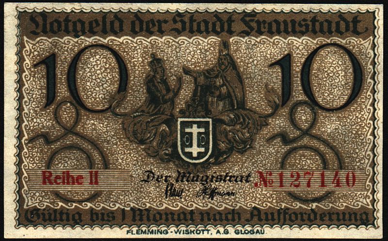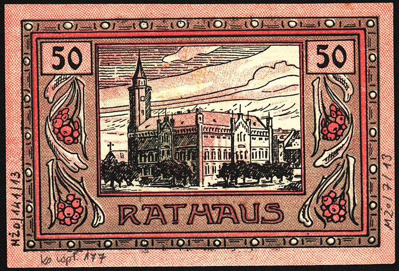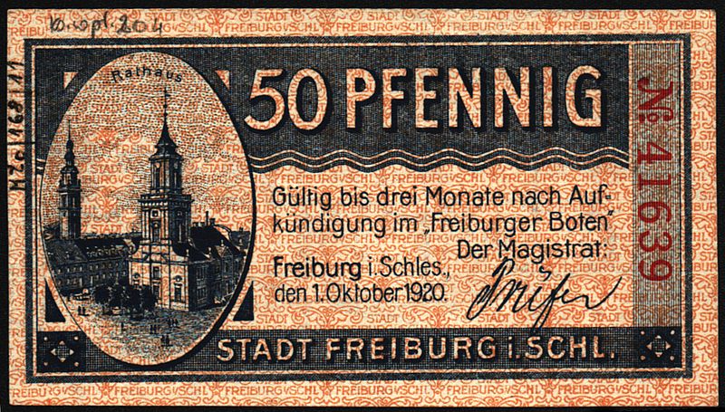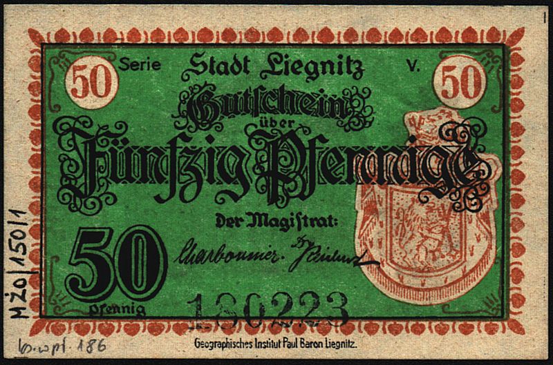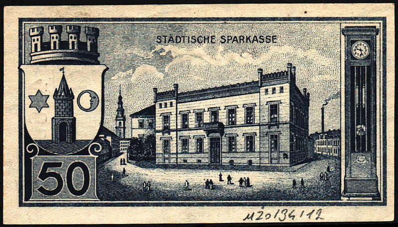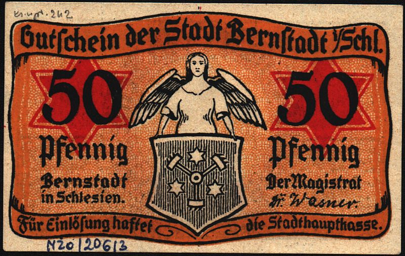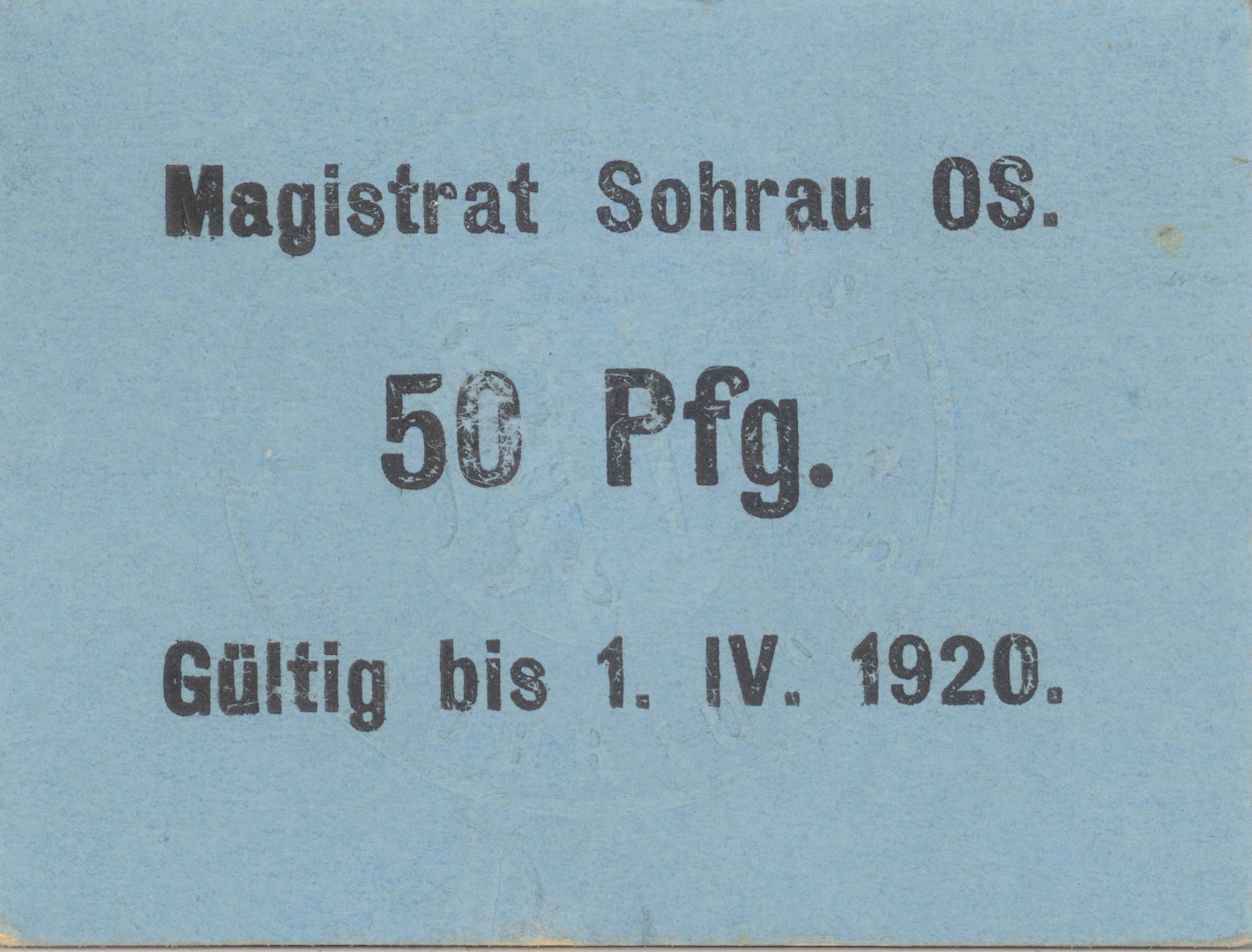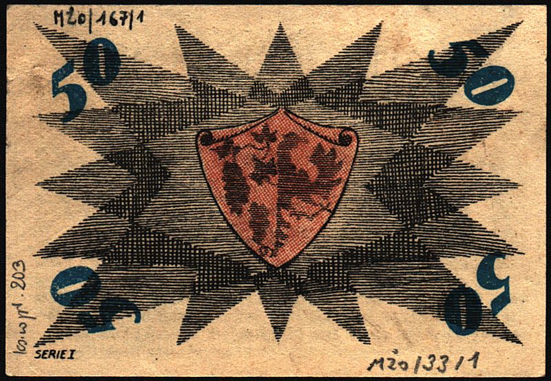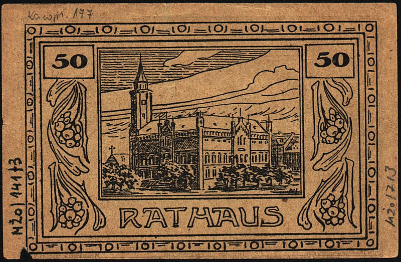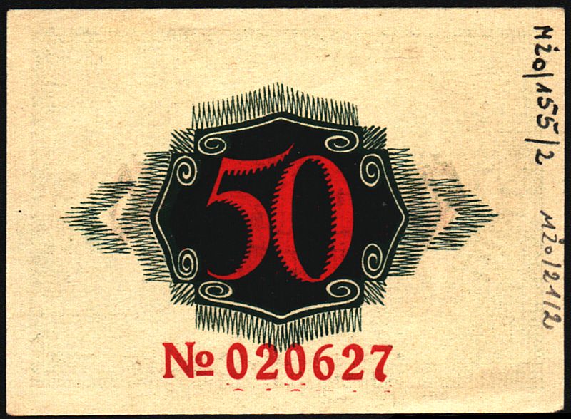Banknot zastępczy o nominale 50 fenigów wydany przez Magistrat Żor.