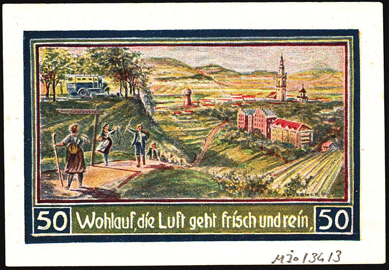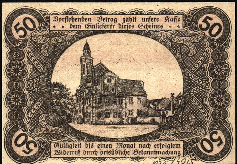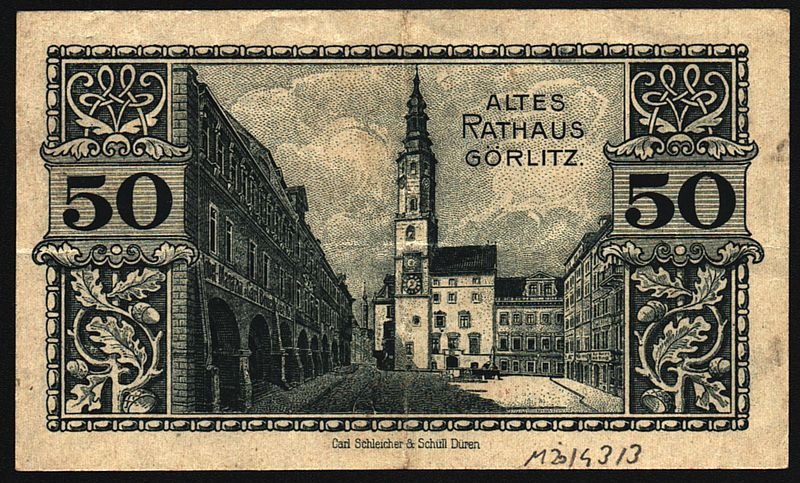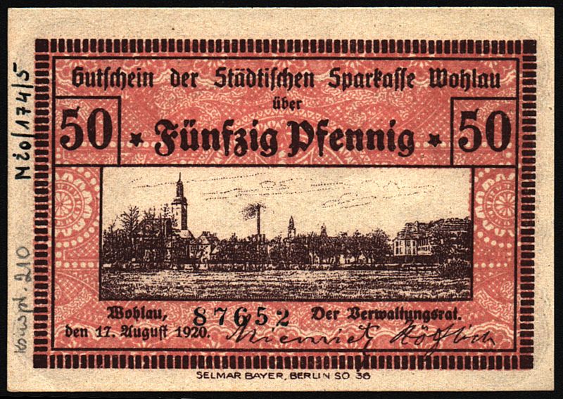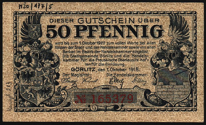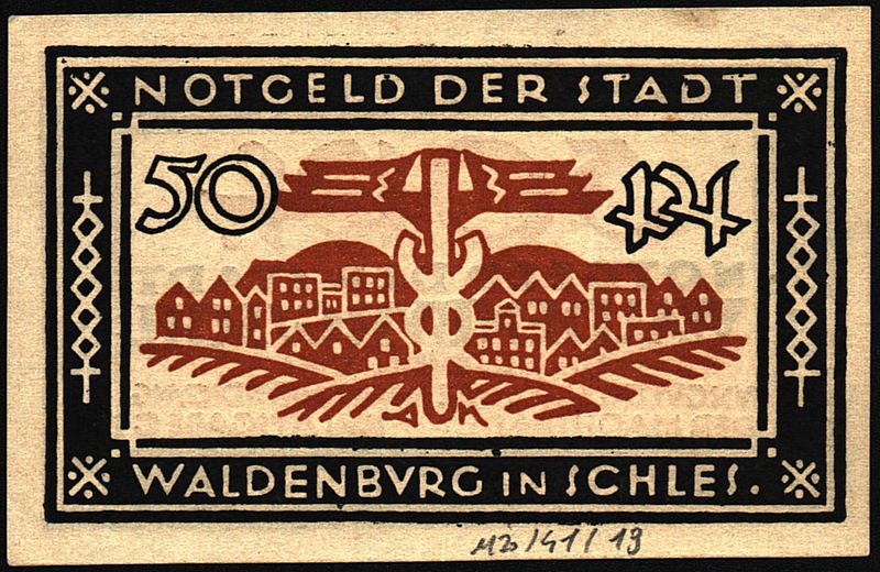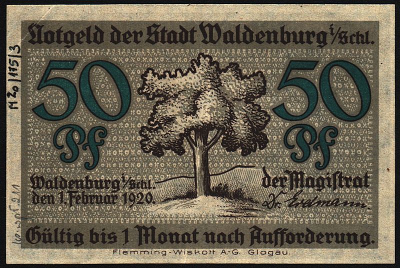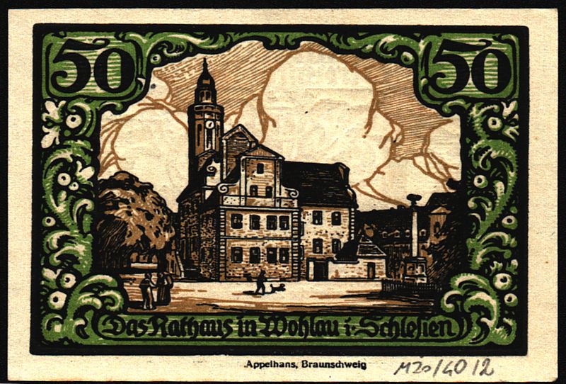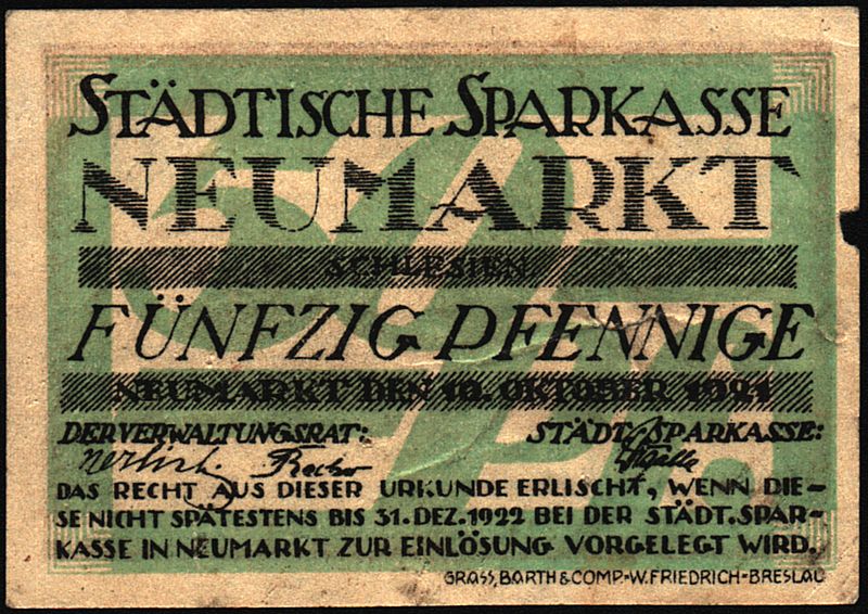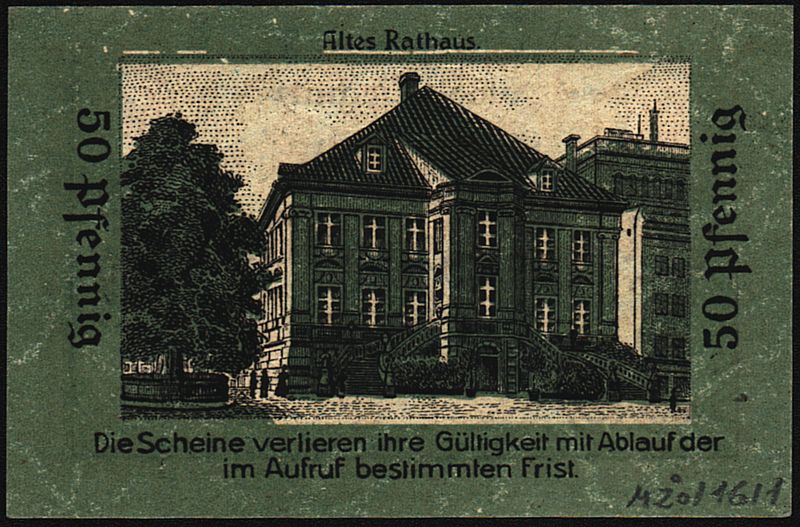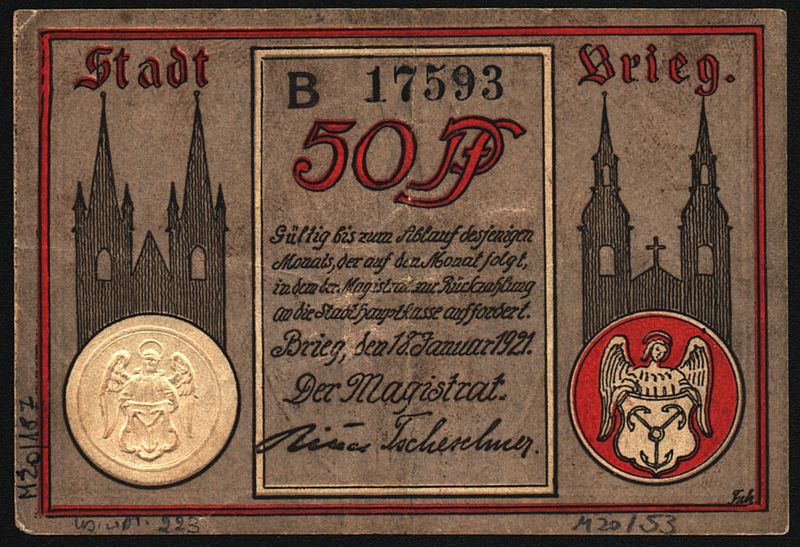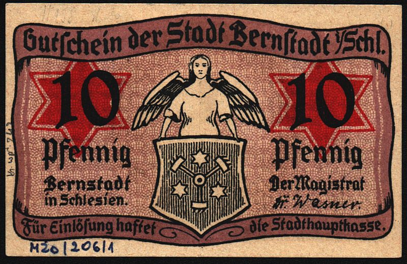 Banknot zastępczy o nominale 50 fenigów wydany przez Magistrat Żor.
