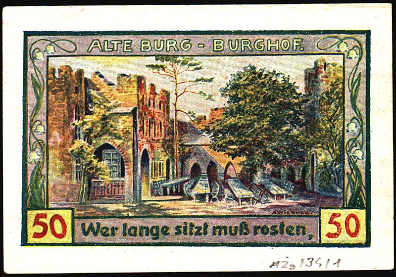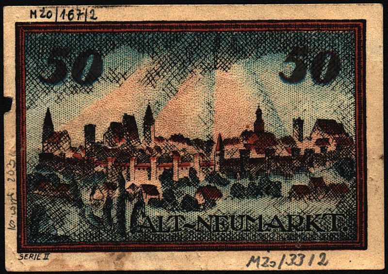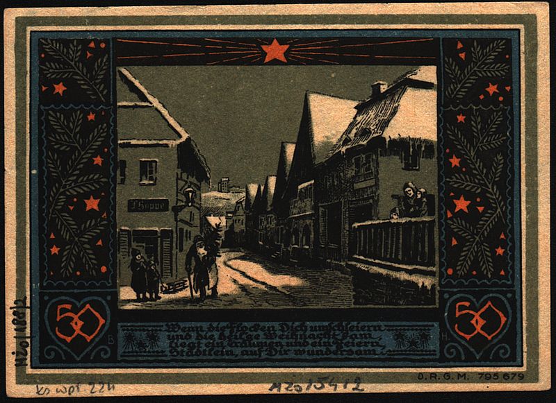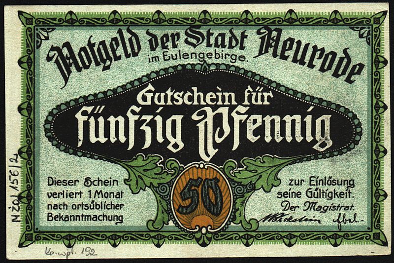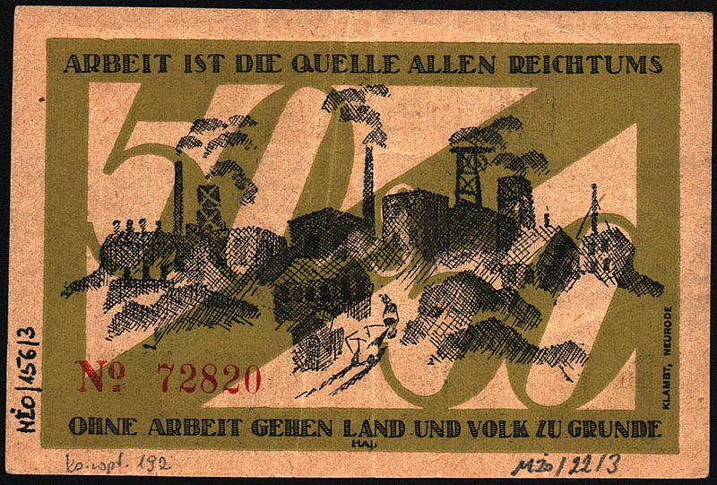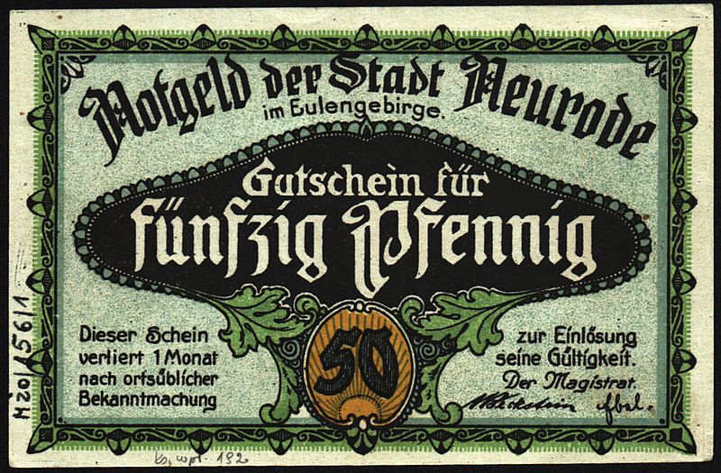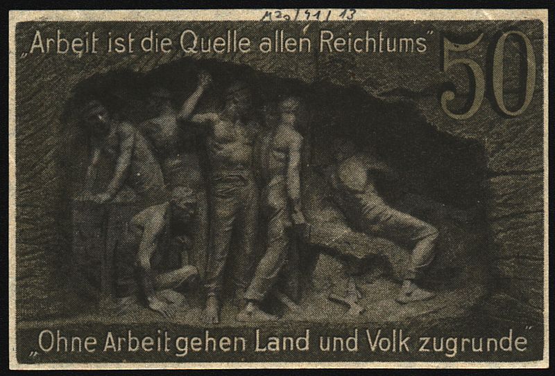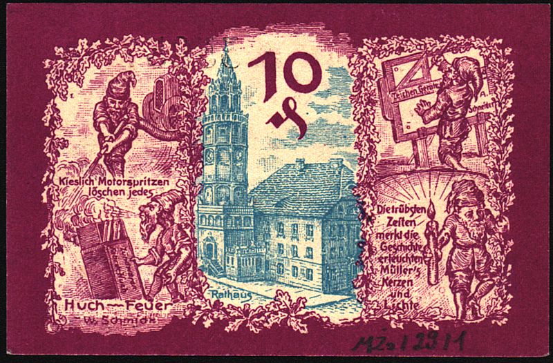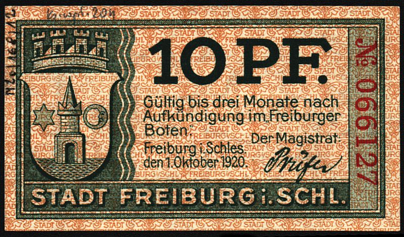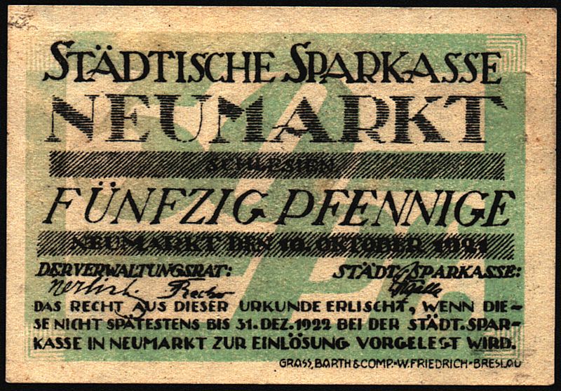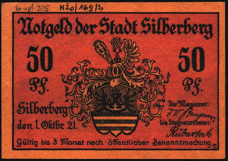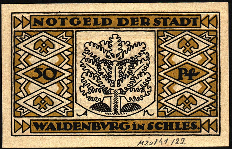 Banknot zastępczy o nominale 50 fenigów wydany przez Magistrat Żor.