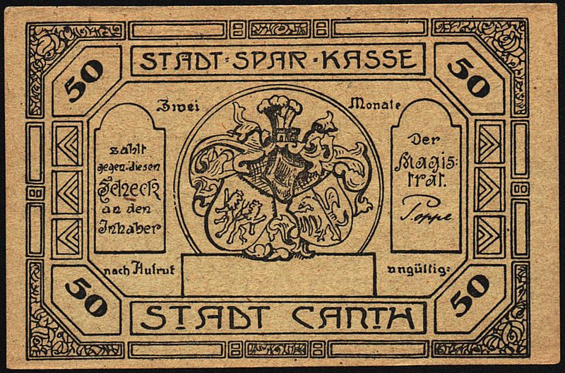 Na awersie napis: Stadt Spar Kasse Stadt Canth (Miejska Kasa Oszczędnościowa, Miasto Kąty Wrocławskie), w centralnej części herb miasta, w rogach symbole nominałów 50. W centralnej części rewersu rycina przedstawiająca ratusz w ówczesnym mieście Canth, pod spodem napis: Rathaus. Po bokach roślinne elementy dekoracyjne, w górnych rogach symbole nominałów 50. Całość otoczona ramką z ornamentem.