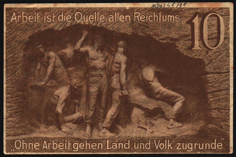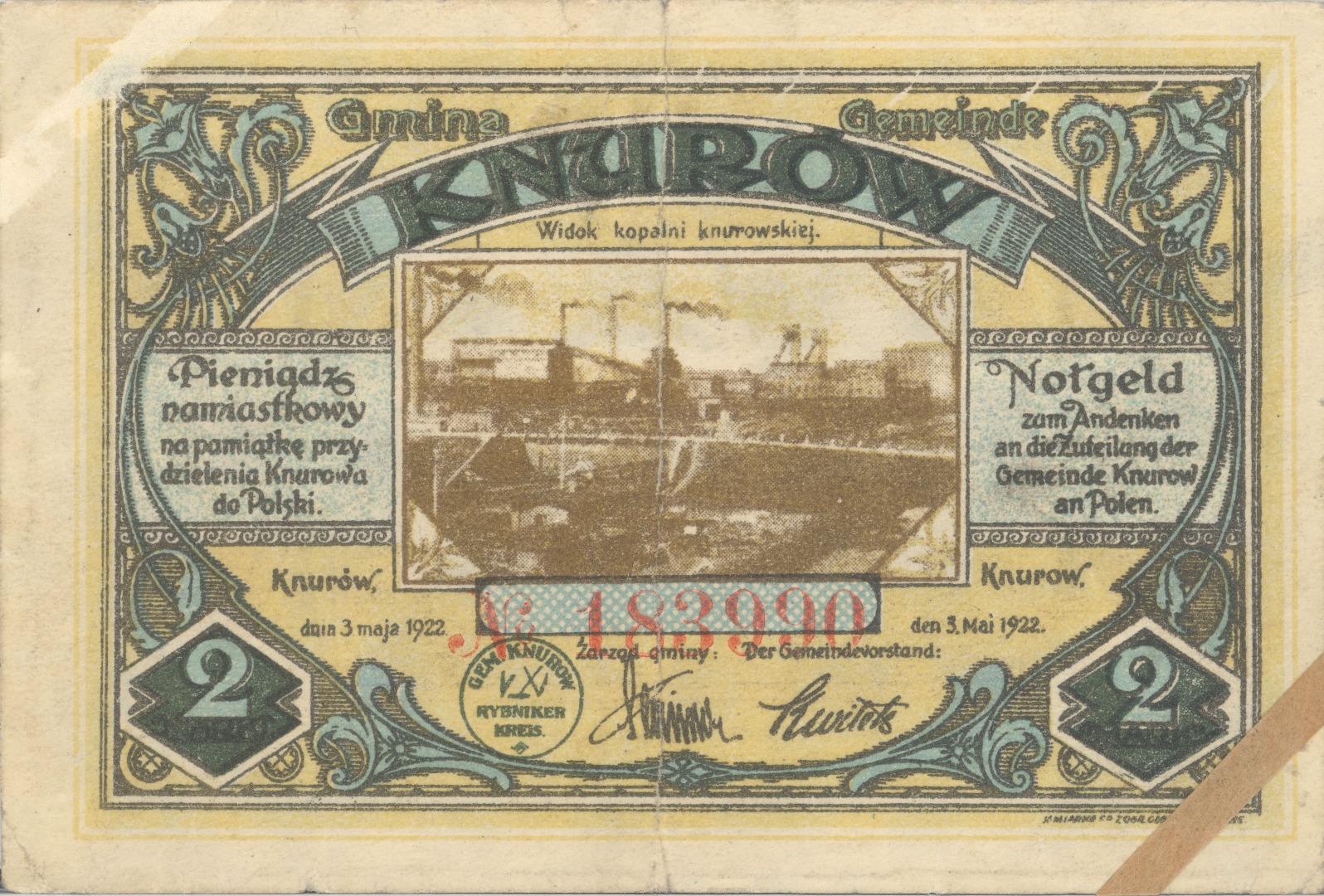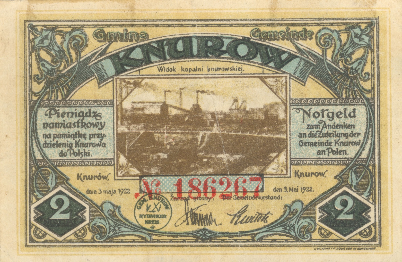 Banknot wydany na pamiątkę przydzielenia Knurowa do Polski; na awersie widok kopalni knurowskiej.