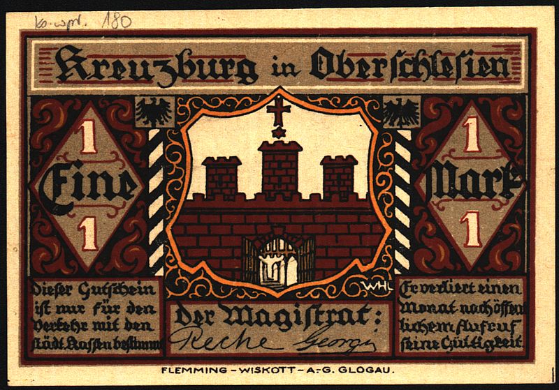 Na awersie w środkowej części fragment herbu miasta, z lewej strony napis: 1 eine, po prawej stronie: 1 mark, powyżej napis: Kreuzburg in Oberschlesien, poniżej napis: Magistrat, podpis nieczytelny. Całość otoczona ramką u dołu nazwa głogowskiej drukarni: Flemming-Wiskott A.-G. Glogau. Na rewersie w środkowej części rysunek przedstawiający stare miasto, poniżej napis: Liebe alte Stadt, po obu bokach: 1 mark.