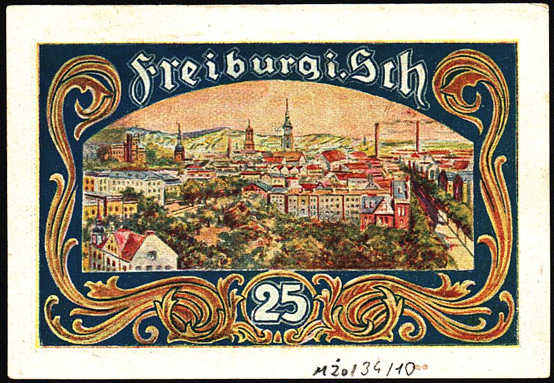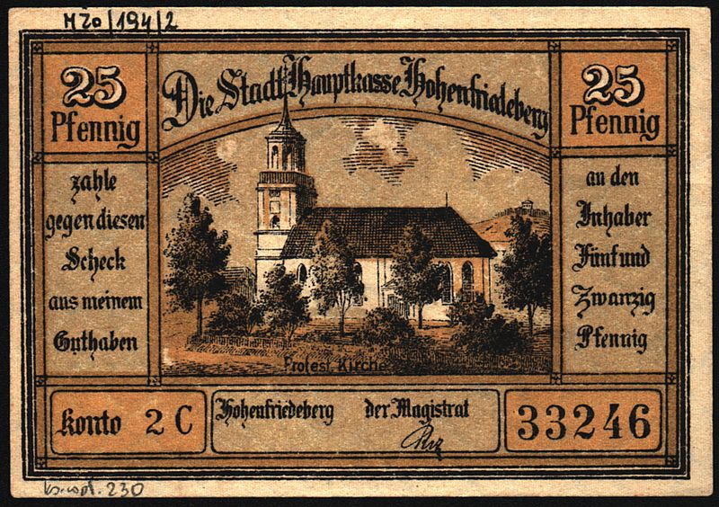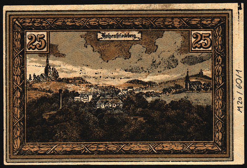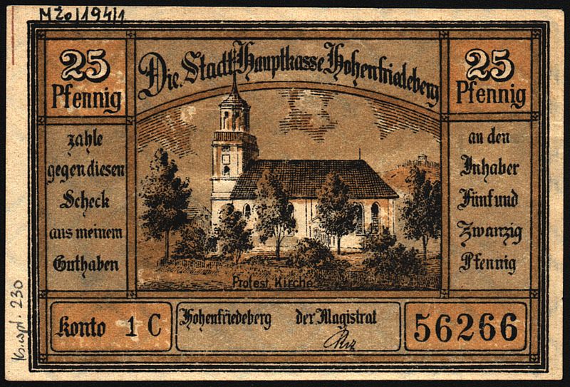 Na awersie w górnej części napisy: Die Stadthauptkasse Hohenfriedeberg, w górnych rogach symbole nominału 25. W środkowej części rycina przedstawiająca kościół protestancki, na dole numer seryjny 1C 56266. Na rewersie rycina przedstawiająca pejzaż i zabudowania miasta, w górnych rogach symbole nominału 25, wszystko otoczone ozdobną ramą.