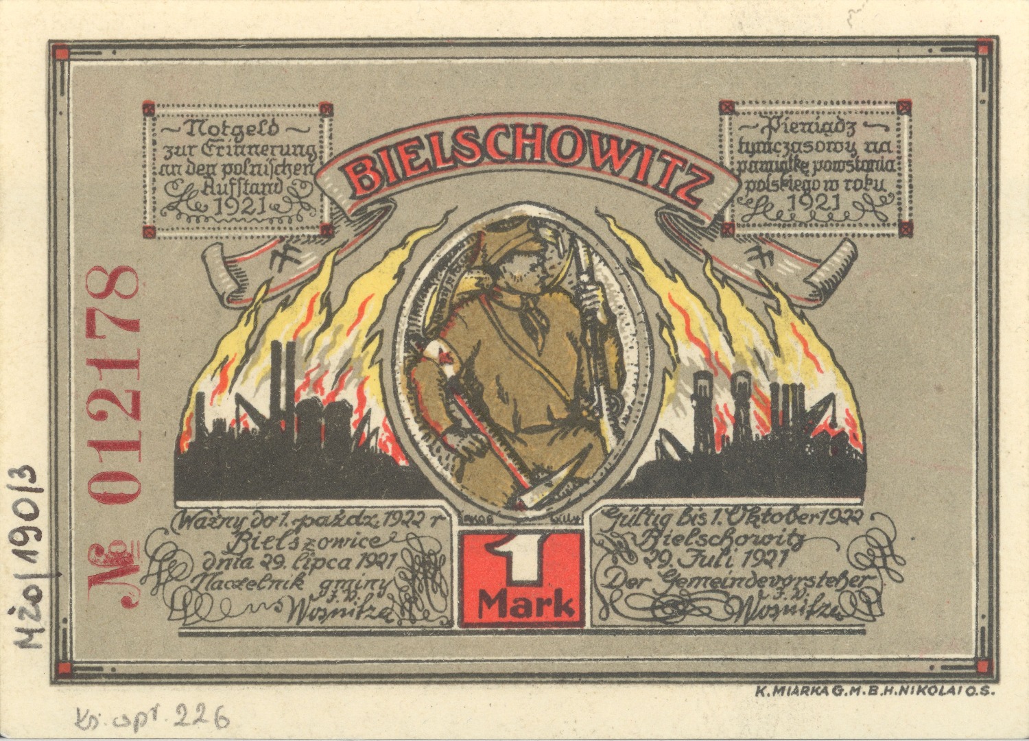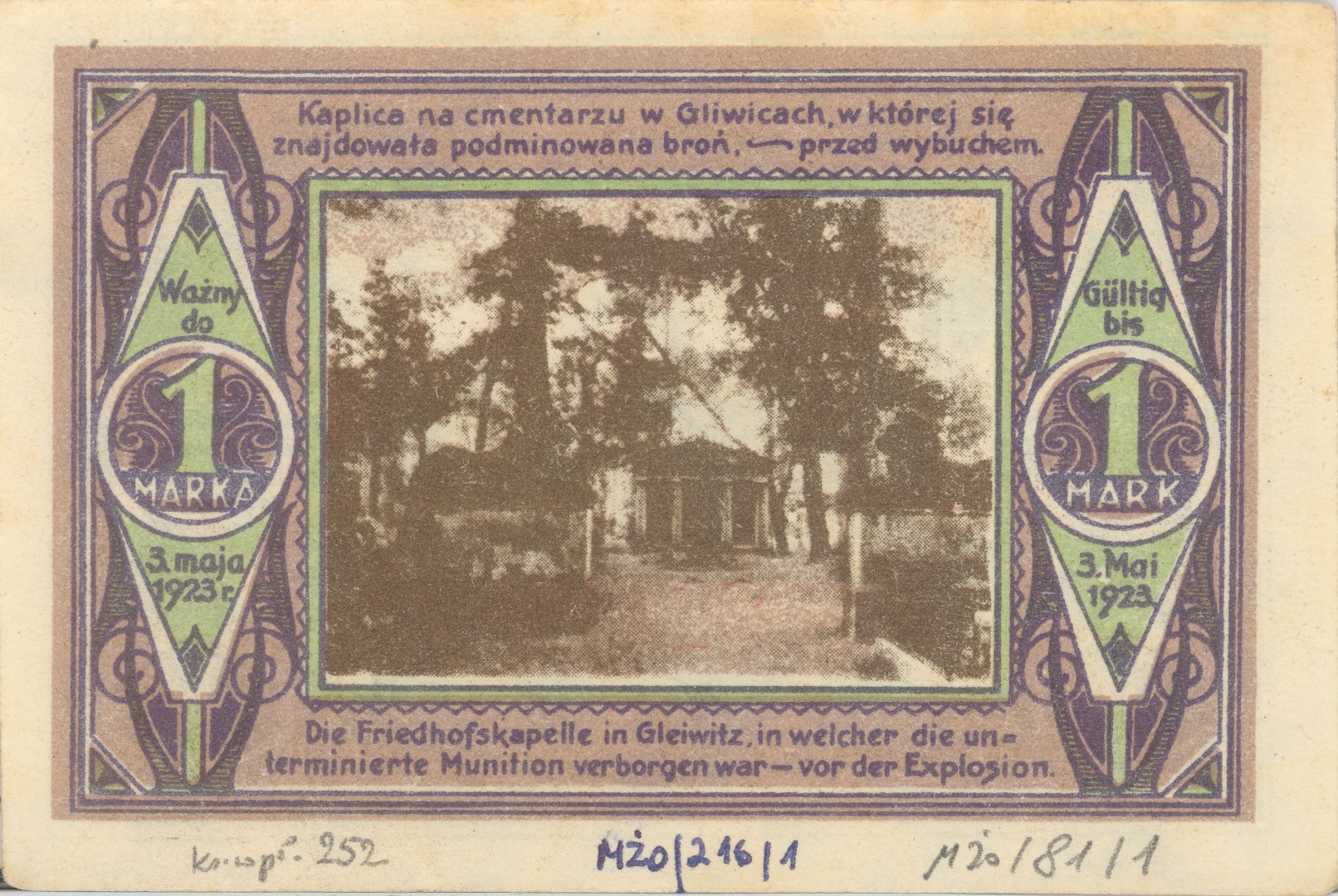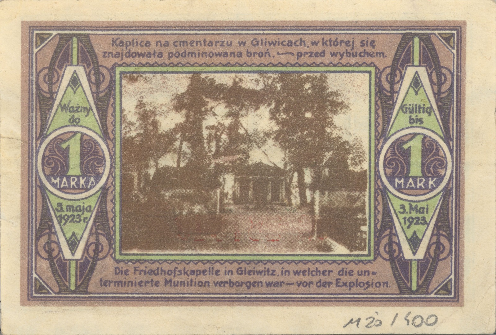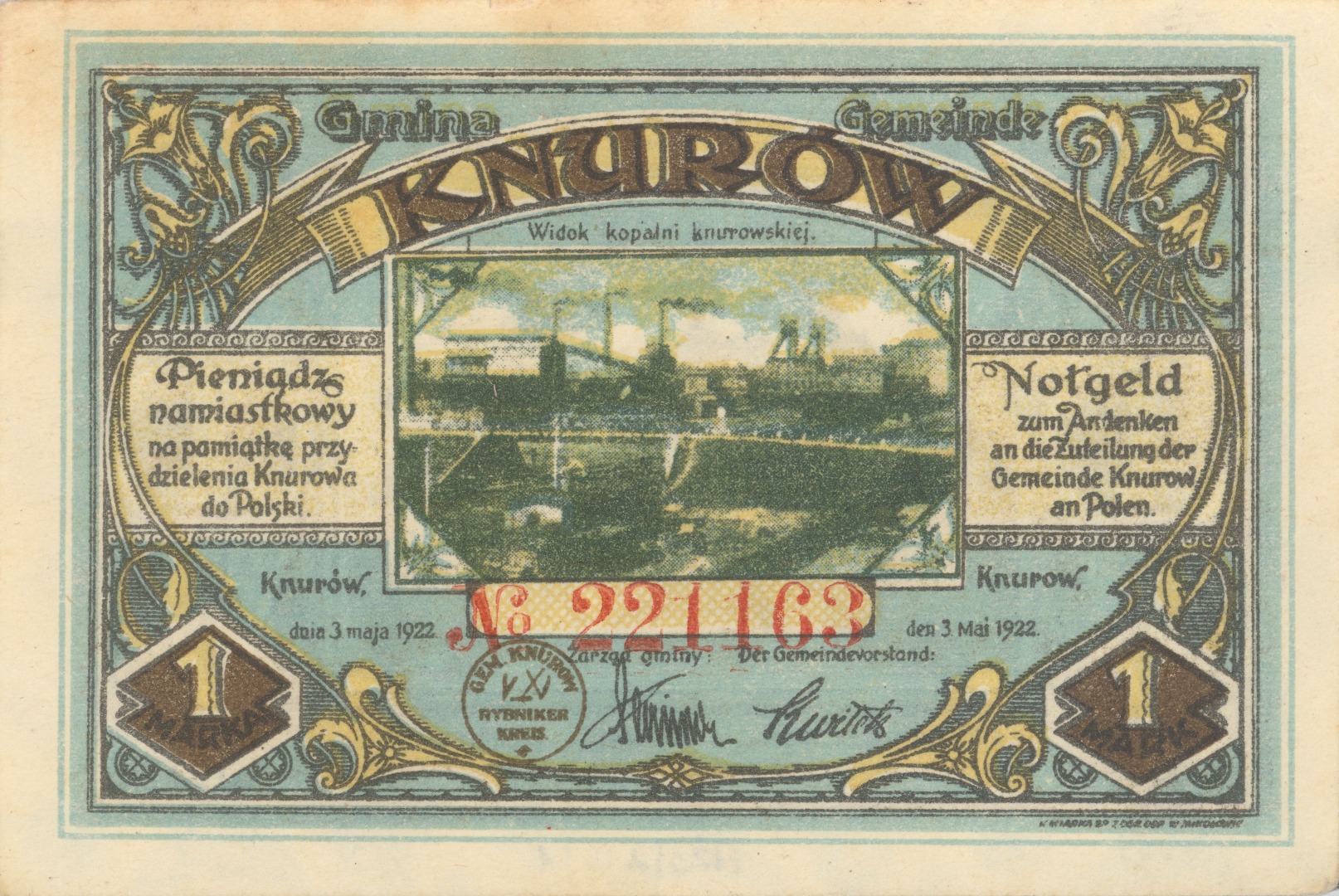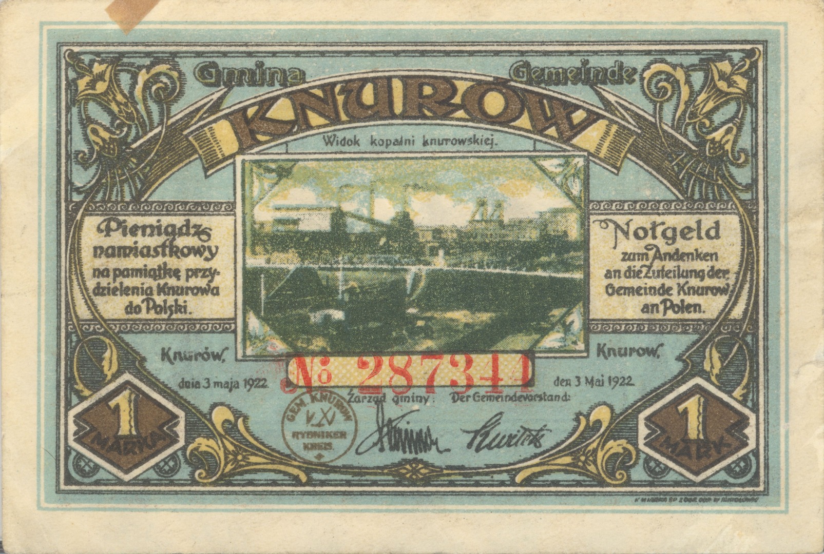 Banknot zastępczy o nominale 1 marki wydany dla gminy Knurów 3 maja 1922 r., ważny do 03 maja 1923r.