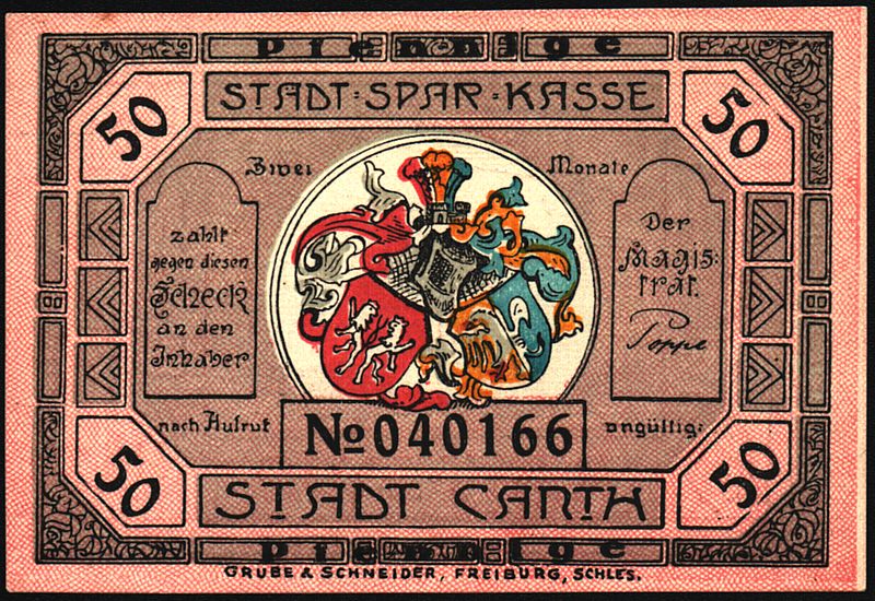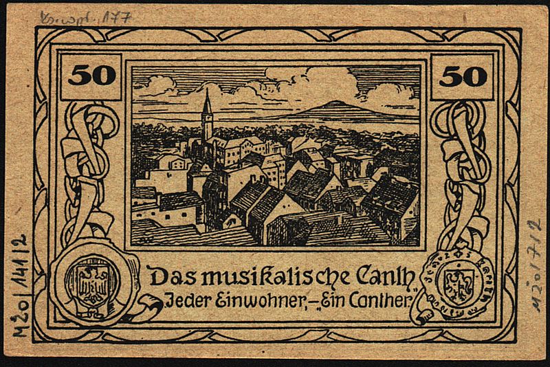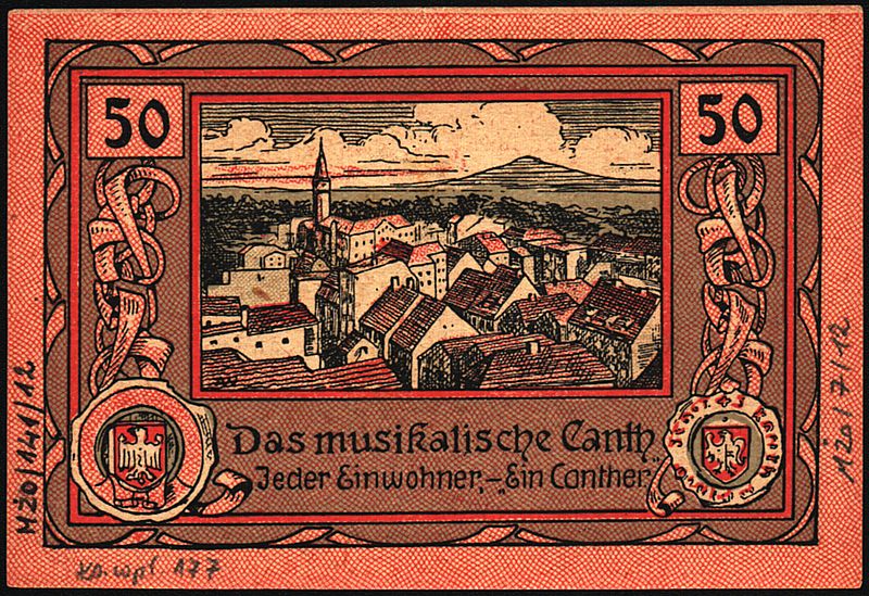 Na awersie napis: Stadt Spar Kasse Stadt Canth (Miejska Kasa Oszczędnościowa, Miasto Kąty Wrocławskie), w centralnej części kolorowy herb miasta, poniżej numer seryjny, w rogach symbole nominałów 50. W centralnej części rewersu rycina przedstawiająca panoramę miasta, poniżej napis: Das musikalische Canth. Jeder Einwohner – Ein Canther. W górnych rogach symbole nominałów 50, całość otoczona ramką.