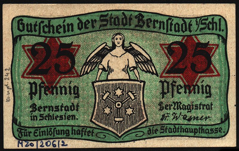 Na awersie w środkowej części herb miasta, z obu stron symbole nominału 25, powyżej napis: Gutschein der Stadt Bernstadt i/Schl, poniżej miejsce wydania: Bernstadt in Schlesien, Der Magistrat, nieczytelny podpis. Na rewersie w środkowej części rycina przedstawiająca zamek w Bierutowie, wokół napis: Stadt Bernstadt in Schlesien, z obu stron symbole nominału 25.