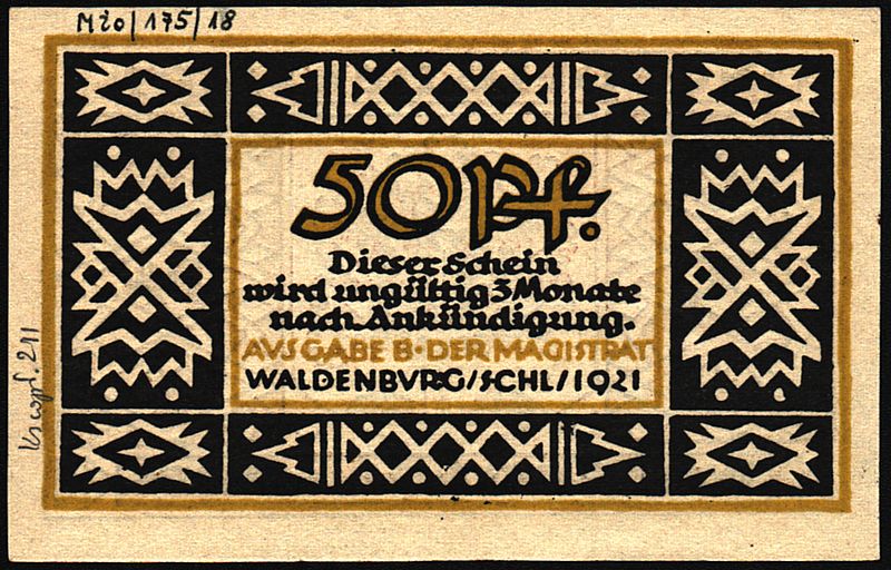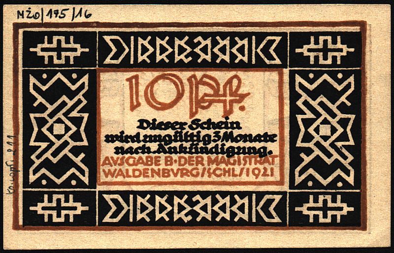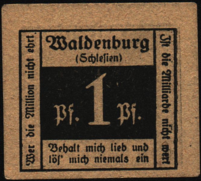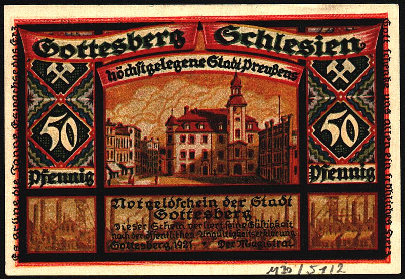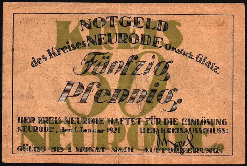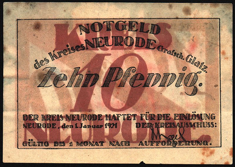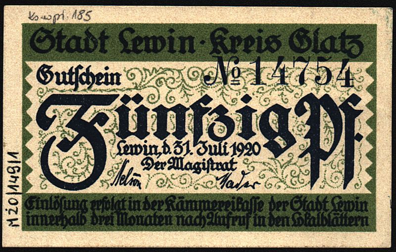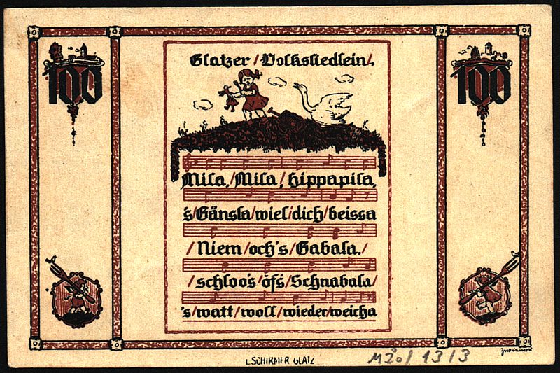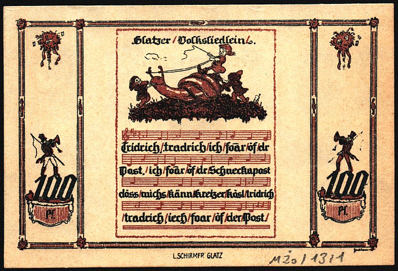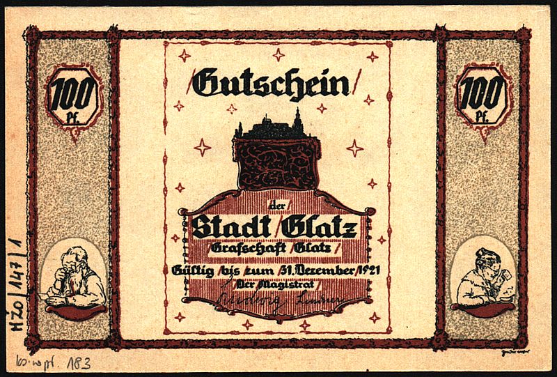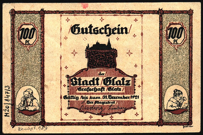 Na określenie pieniędzy namiastkowych używano także terminu „kupony”. Na awersie w górnej części napis: Gutschein, poniżej miniatura panoramy miasta i napis: der Stadt Glatz, Grafschaft Glatz, Gűltig bis zum 31 Dezember 1921, Der Magistrat. Nieczytelne podpisy. W górnych rogach symbol nominału 100 pf. Na rewersie w środkowej części zapis nutowy pieśni ludowej i napis: Glatzer Volksliedlein. Po obu bokach symbol nominału 100 pf.