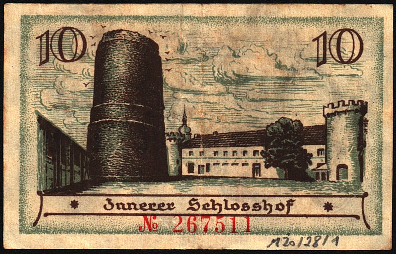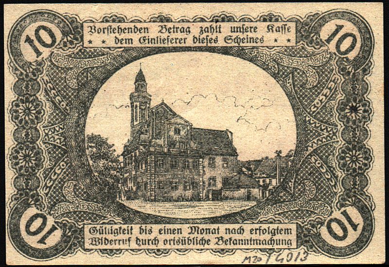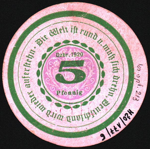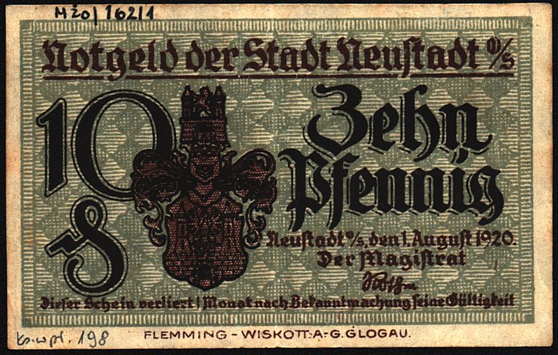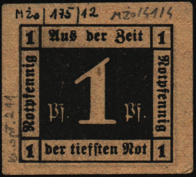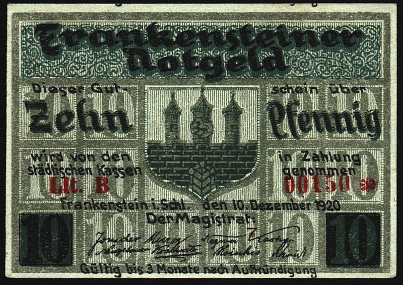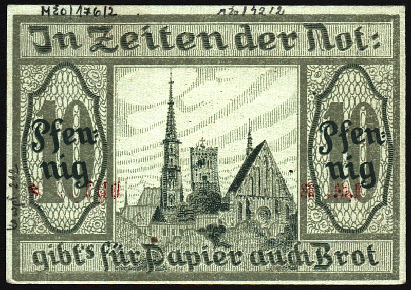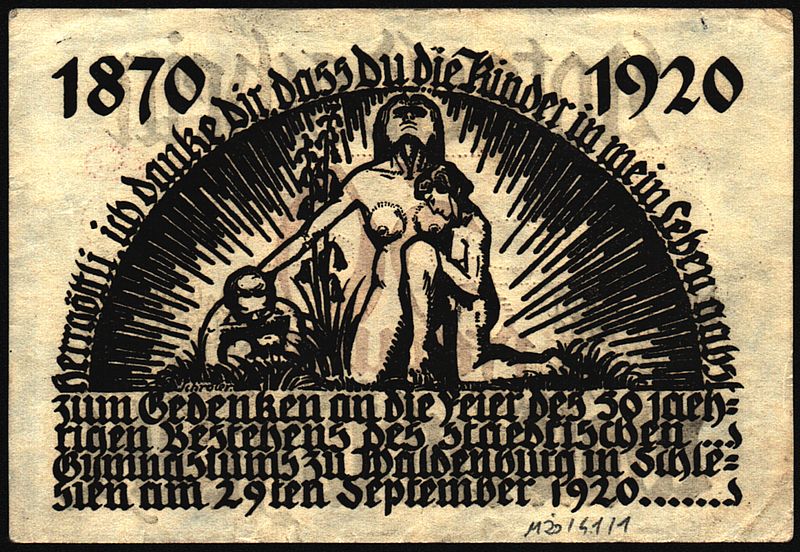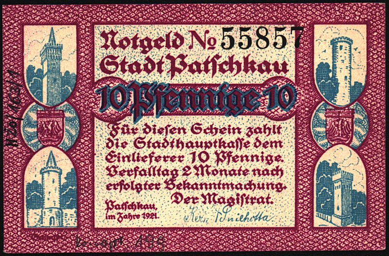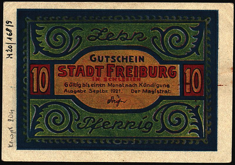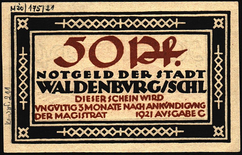 Na określenie pieniędzy namiastkowych używano także terminu „kupony”. Na awersie w górnej części napis: Gutschein, poniżej miniatura panoramy miasta i napis: der Stadt Glatz, Grafschaft Glatz, Gűltig bis zum 31 Dezember 1921, Der Magistrat. Nieczytelne podpisy. W górnych rogach symbol nominału 100 pf. Na rewersie w środkowej części zapis nutowy pieśni ludowej i napis: Glatzer Volksliedlein. Po obu bokach symbol nominału 100 pf.