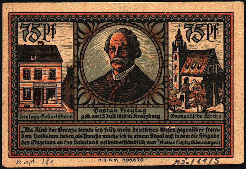 Na awersie w środkowej części herb miasta, powyżej napis: Kreuzburg in Oberschlesien, poniżej data emisji: Kreuzburg O/S, den 18 october 1921, Magistrat, podpis nieczytelny, w dolnych rogach napis 75 pfennig. Całość otoczona ramką u dołu nazwa głogowskiej drukarni: Flemming-Wiskott A.-G. Glogau. Na rewersie w środkowej części portret Gustava Freytaga po obu jego stronach rysunki przedstawiające budynki (dom urodzin Freytaga i kościół ewangelicki) w ich górnych częściach symbol nominału 75 pf.