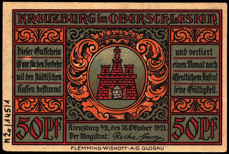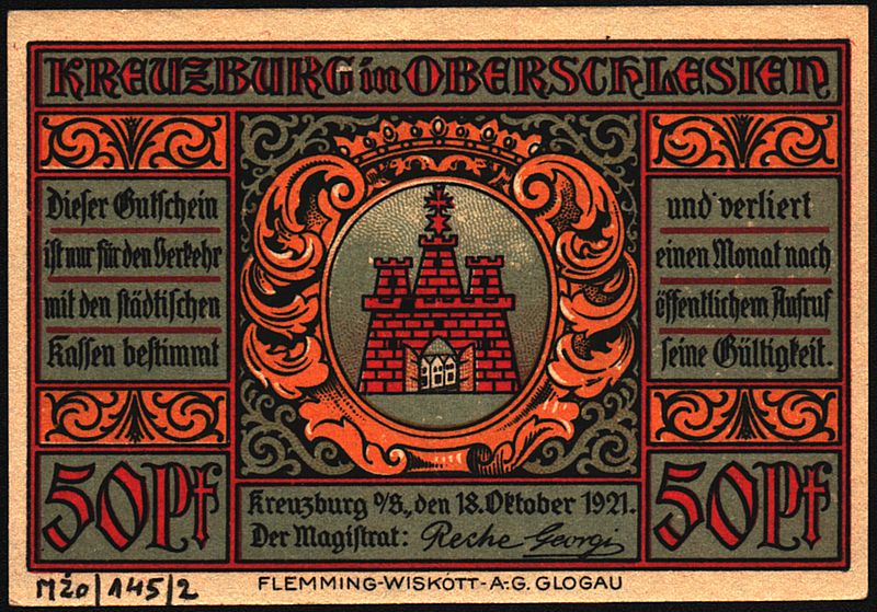Na awersie w środkowej części herb miasta, powyżej napis: Kreuzburg in Oberschlesien, poniżej data emisji: Kreuzburg O/S, den 18 october 1921, Magistrat, podpis nieczytelny, w dolnych rogach napis: 50 pfennig. Całość otoczona ramką u dołu nazwa głogowskiej drukarni: Flemming-Wiskott A.-G. Glogau. Na rewersie znajduje się rysunek przedstawiający budynki w centrum miasta, po bokach dwie stojące postacie męskie poniżej nich symbol nominału 50 pf.