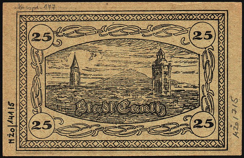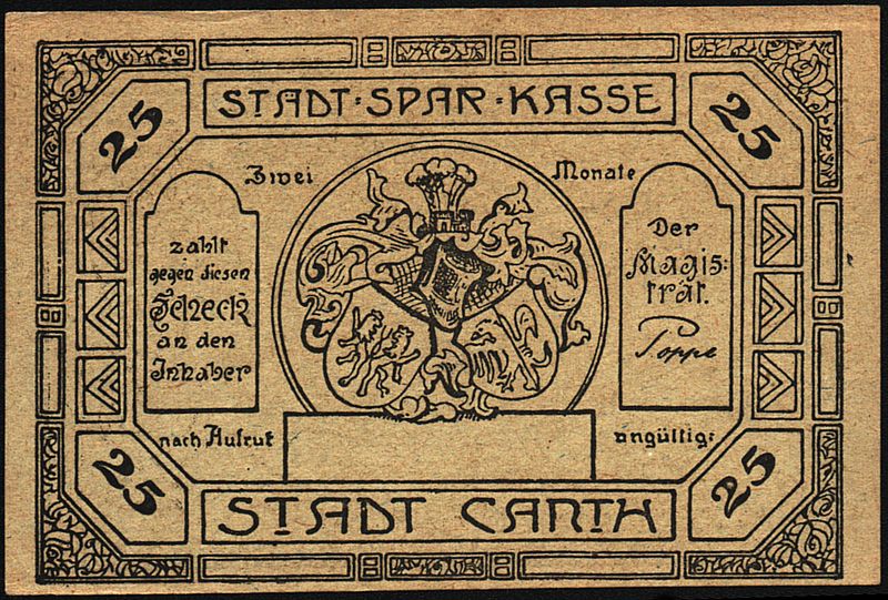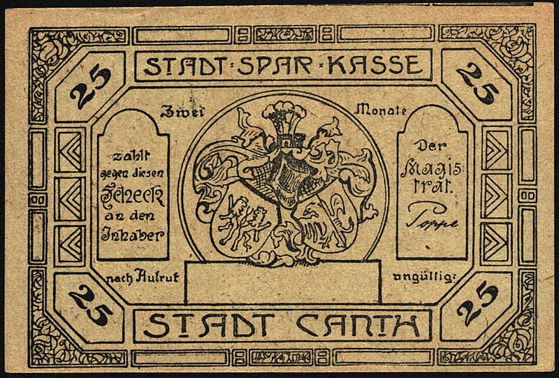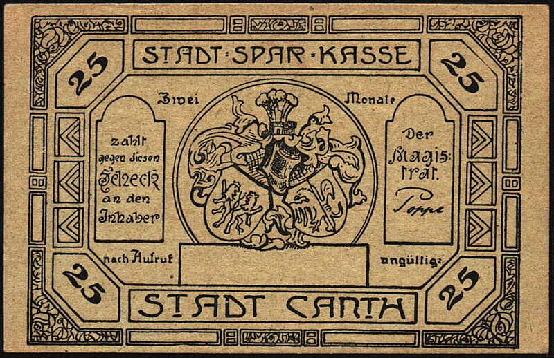 Na awersie napis: Stadt Spar Kasse Stadt Canth (Miejska Kasa Oszczędnościowa, Miasto Kąty Wrocławskie), w centralnej części herb miasta, w rogach symbole nominałów 25. W centralnej części rewersu rycina przedstawiająca widok na miasto, pod spodem napis: Stadt Canth. Po bokach elementy dekoracyjne, w rogach symbole nominałów 25. Całość otoczona ramką z ornamentem.