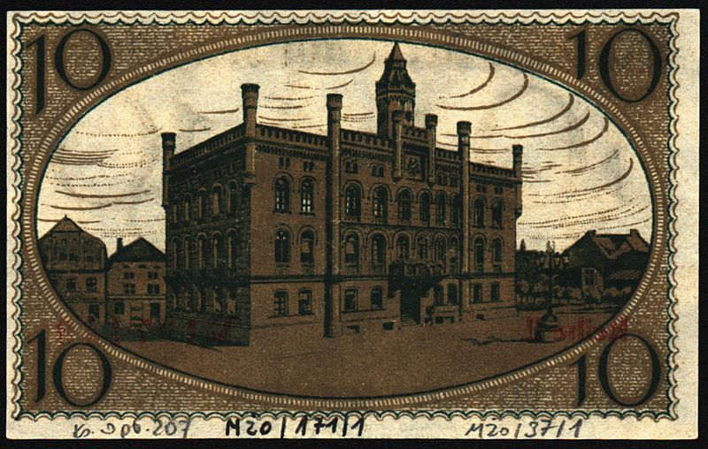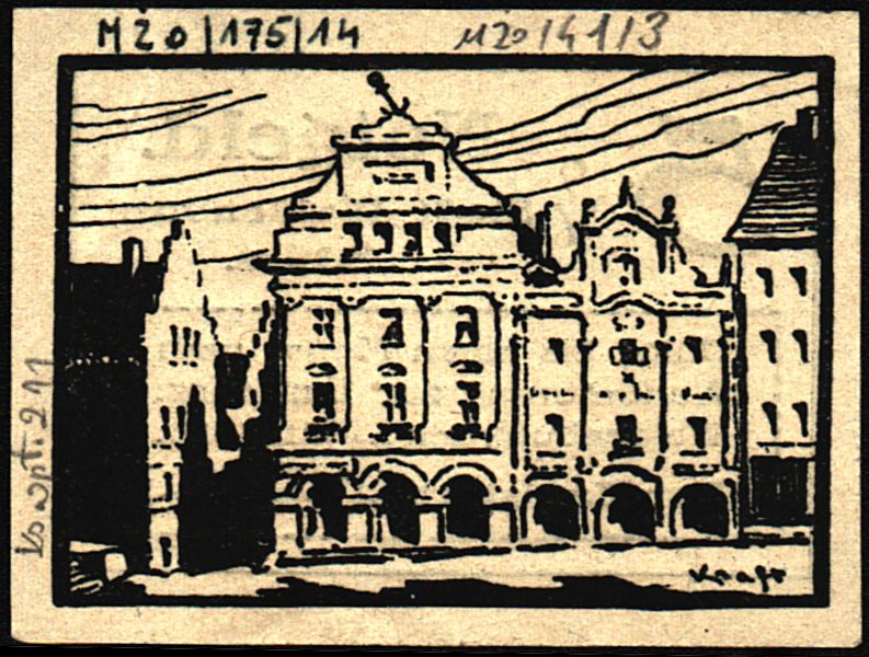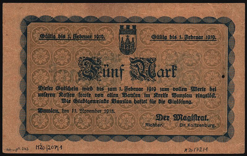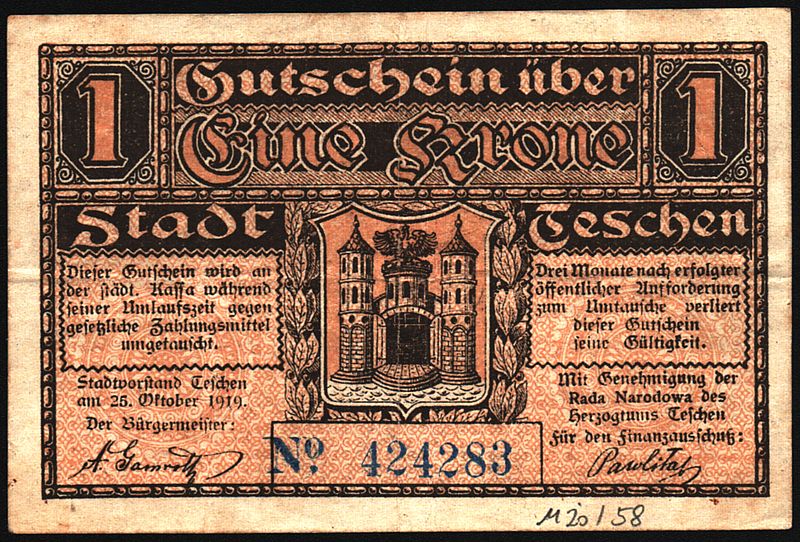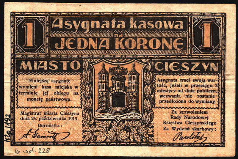 Asygnata kasowa na 1 koronę. Na awersie pośrodku wizerunek przedstawiający dwie wieże z bramą pośrodku. Po lewej stronie napis: Niniejszą asygnatę wymieni kasa miejska w terminie jej obiegu na monetę państwową. Po prawej stronie napis: Asygnata traci swoją wartość, jeżeli w przeciągu 3 miesięcy od dnia publicznego wezwenia nie zostanie przedłożona do wymiany.