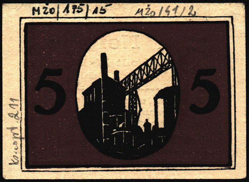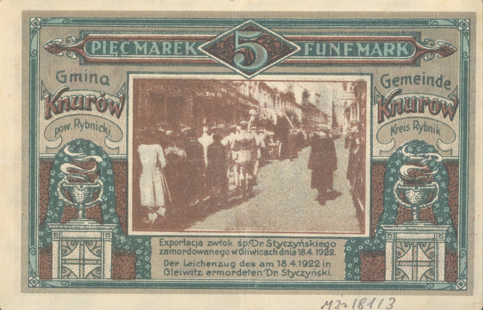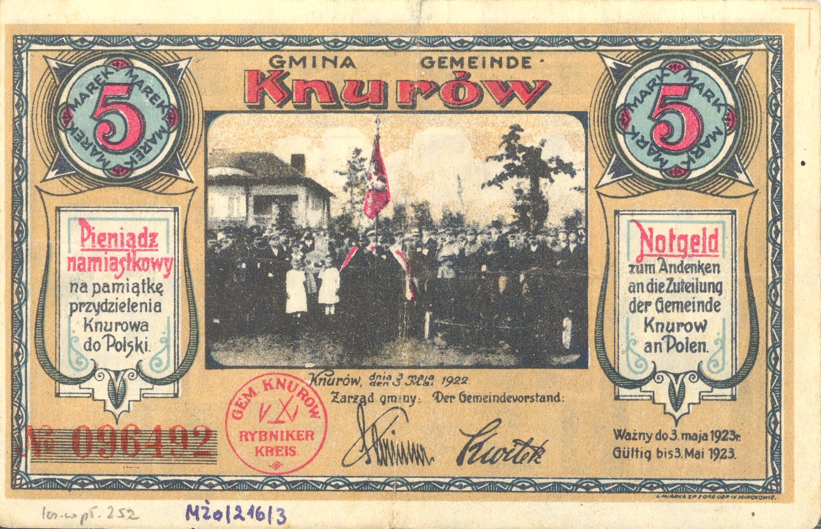 Banknot zastępczy o nominale 5 marek wydany dla gminy Knurów 3 maja 1922 r., ważny do 03 maja 1923r.