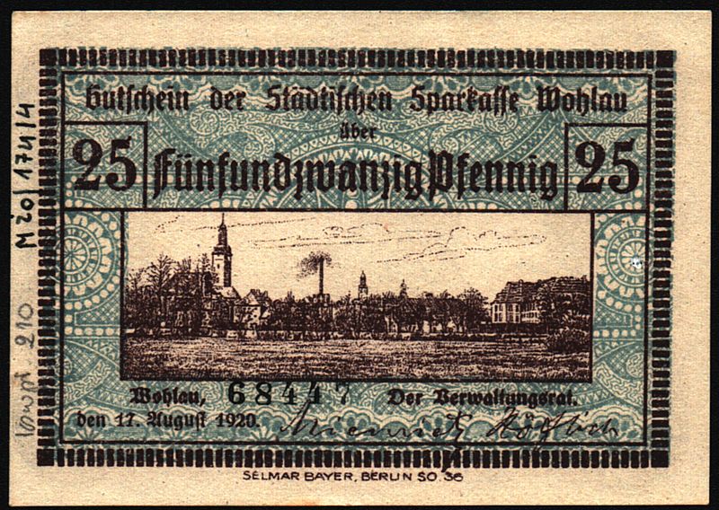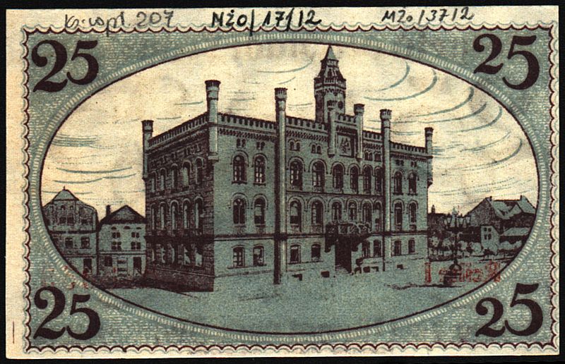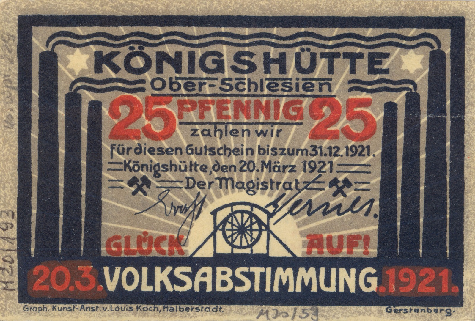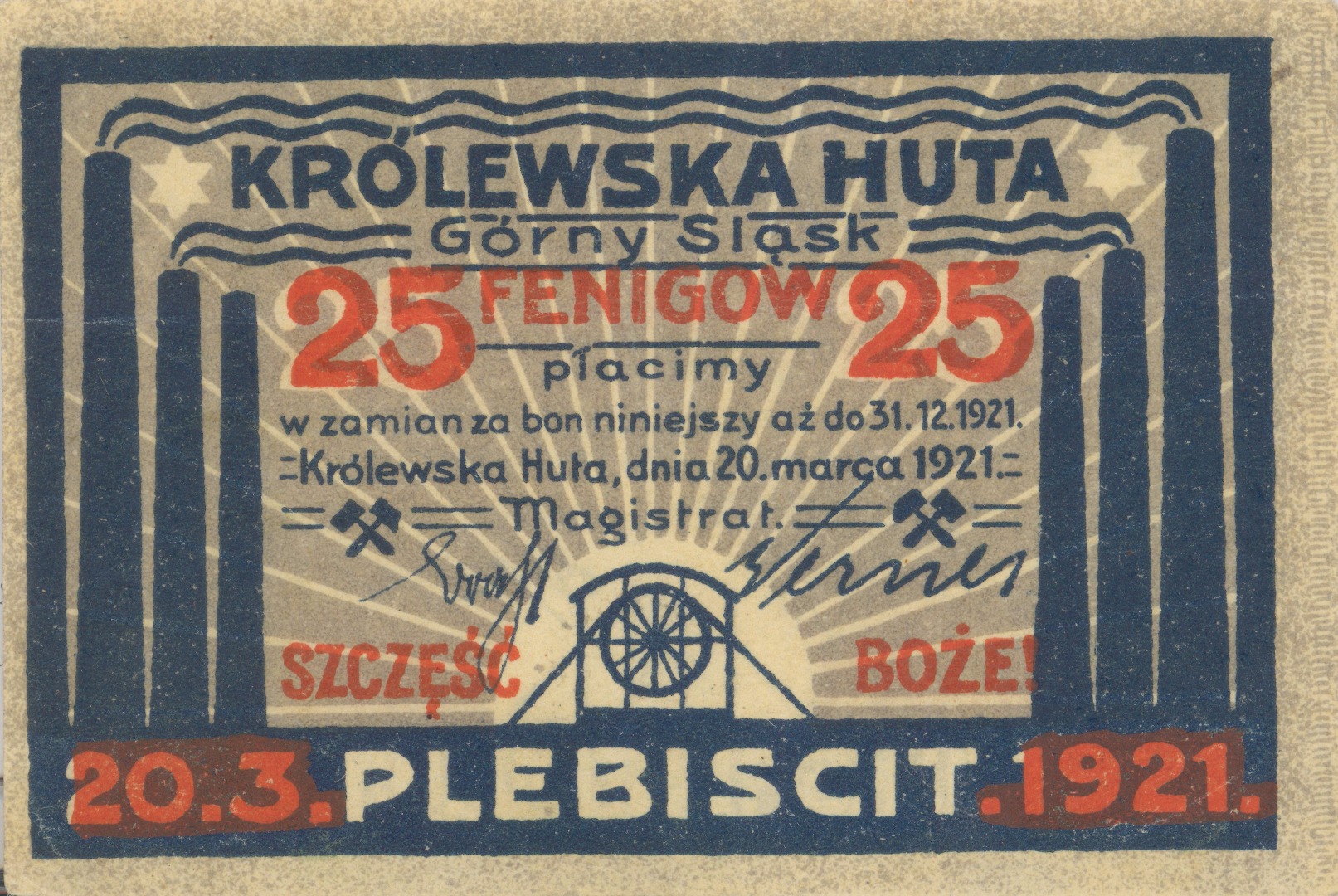 Banknot zastępczy o nominale 25 fenigów wydany przez magistrat Królewskiej Huty na dzień