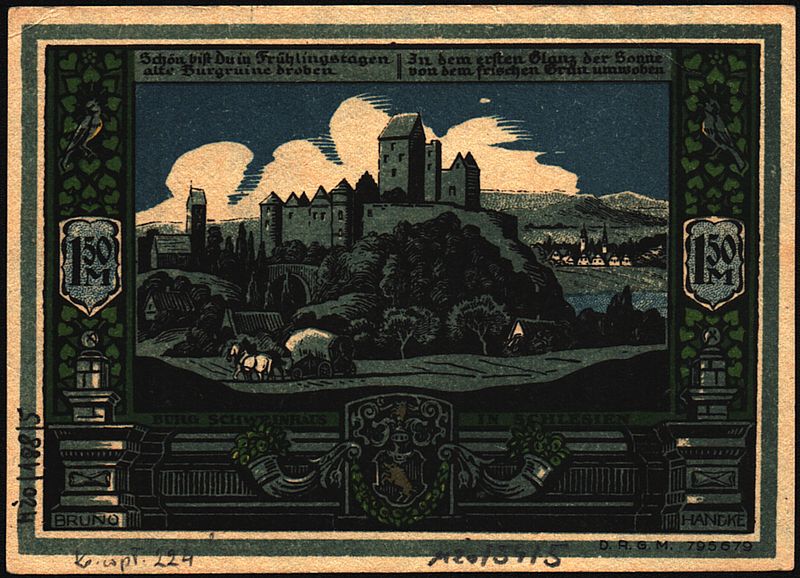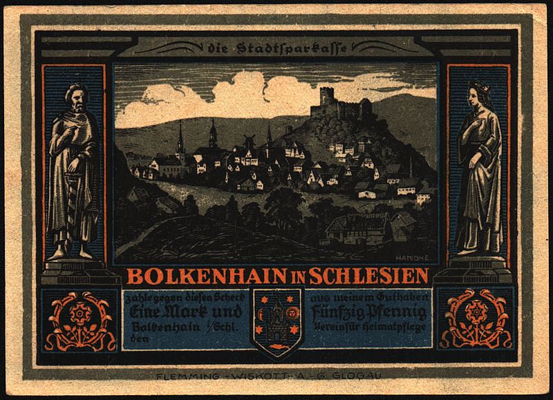 Na awersie panorama miasta z dominujący nad nim zamkiem, poniżej napis: Bolkenhain i. Schlesien, na dole herb miasta, po bokach figurki mężczyzny i kobiety. Na rewersie rycina przedstawiająca wzgórze zamkowe, po bokach symbol nominału 1,50. Wykonano w głogowskiej drukarni Flemming-Wiskott A.-G. Glogau.