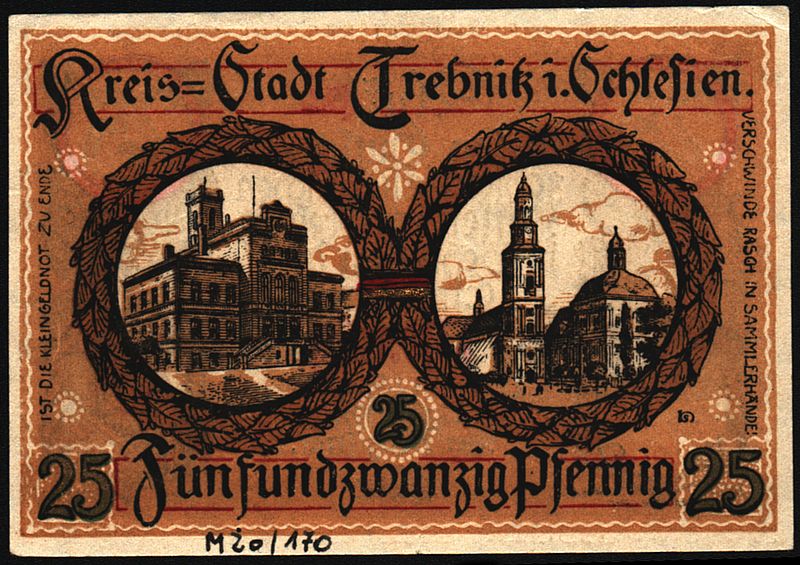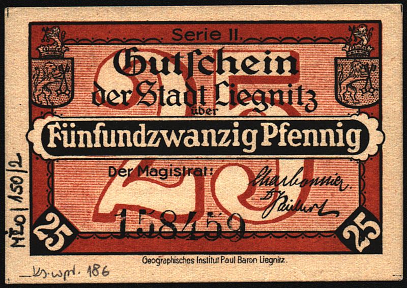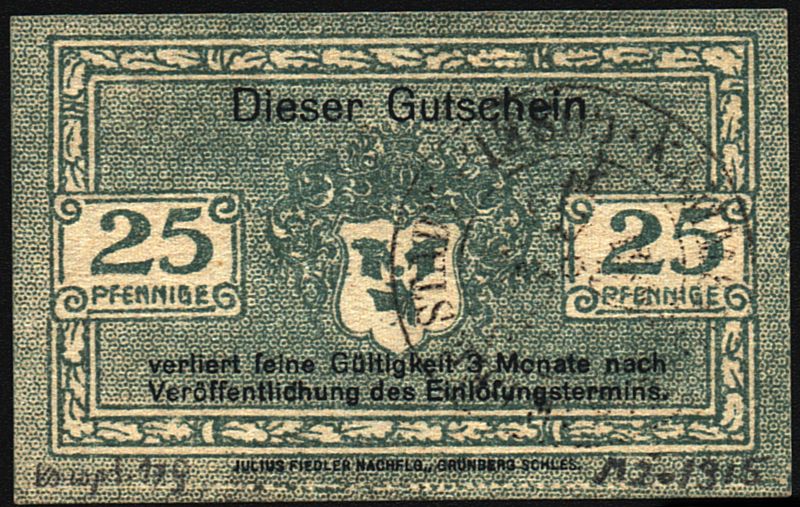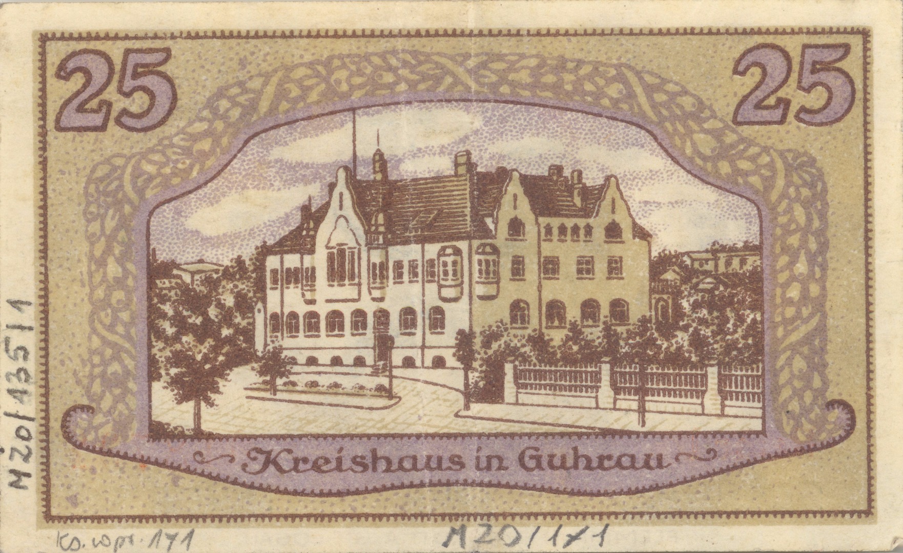 Banknot zastępczy o nominale 25 fenigów wydany dla Guhrau (Góra Śląska).