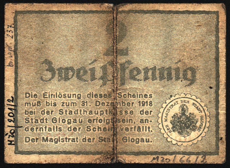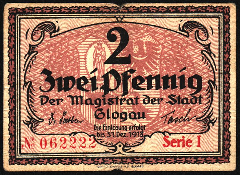 Na awersie w środkowej części symbol nominału 2, poniżej napis: Zwei Pfennig Der Magistrat der Stadt Glogau, informacja o dacie ważności: Die Einlösung erfolgt bis 31. Dez. 1918 i numer seryjny: nr 062222 Serie I. Na rewersie powtórzono informacje z awersu wydrukowane w szarościach. Wykonano w drukarni: Carl Flemming AG. Glogau u. Berlin.