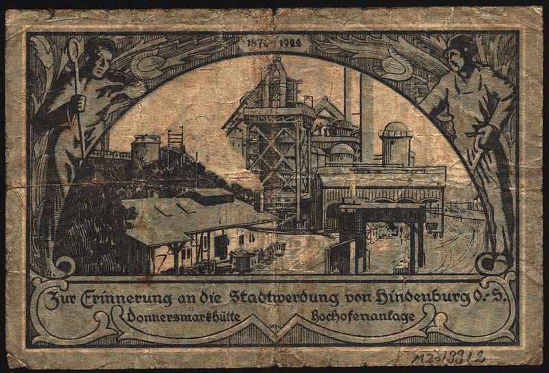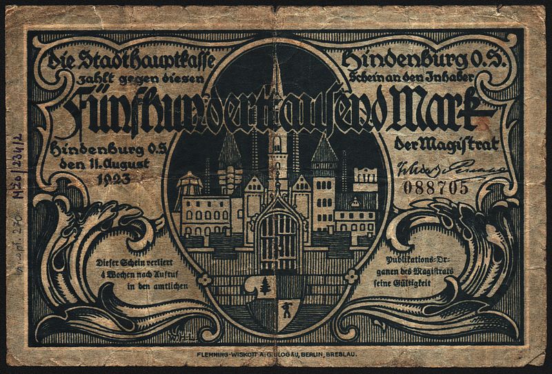 Na awersie w środkowej części architektura miasta góry napis: Die Stadthauptkasse Hindenburg O.S., Fűnfhunderttausend Mark, poniżej miejsce i data wydania: Hindenburg O.S. den 11 august 1923, Der Magistrat, nieczytelny podpis i numer serii 088750. Na rewersie rycina przedstawiająca przemysłowy krajobraz, poniżej napis: Zur Frinerung an der Stadtwerbung von Hindenburg O.-S, Donnersmarkhűtte Bochofenanlage. Wykonano w drukarni Flemming-Wiskott A.-G. Glogau, Berlin, Breslau.