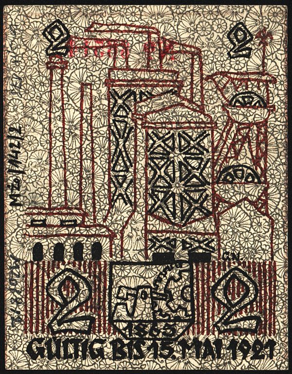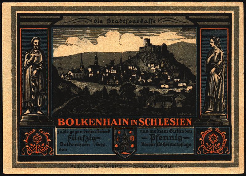 Na awersie panorama miasta z dominujący nad nim zamkiem, poniżej napis: Bolkenhain i. Schlesien, na dole herb miasta, po bokach figurki mężczyzny i kobiety. Na rewersie rycina przedstawiająca uliczkę (zabudowania i drzewa), po bokach symbol nominału 2. Wykonano w głogowskiej drukarni Flemming-Wiskott A.-G. Glogau.