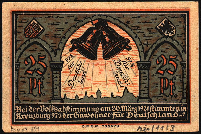 Na awersie w środkowej części herb miasta, powyżej napis: Kreuzburg in Oberschlesien, poniżej data emisji: Kreuzburg O/S, den 18 october 1921, Magistrat, podpis nieczytelny, w dolnych rogach napis: 25 pfennig. Całość otoczona ramką u dołu nazwa głogowskiej drukarni: Flemming-Wiskott A.-G. Glogau. Na rewersie trzy łuku, w środkowym, największym znajduje się rysunek przedstawiający dwa dzwony, po bokach symbol nominału 25 pf.