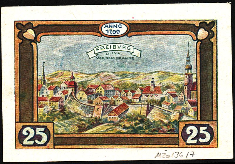 Na awersie w górnej części napisy: Die Stadthauptkasse Hohenfriedeberg, w górnych rogach symbole nominału 25. W środkowej części rycina przedstawiająca kościół protestancki, na dole numer seryjny 2C 33246. Na rewersie rycina przedstawiająca pomnik z 1910 roku, ustawiony w 165. rocznicę bitwy między wojskami pruskimi i austriackimi (tzw. wojny śląskie). Poniżej symbol nominału 25.