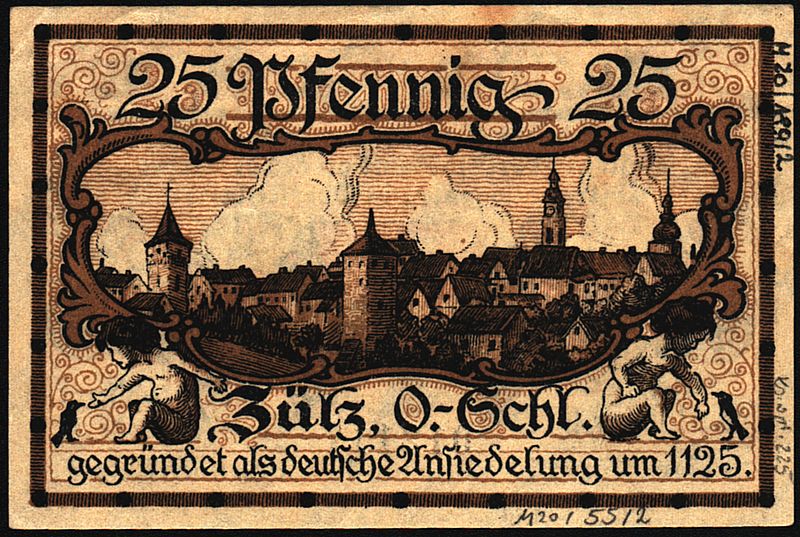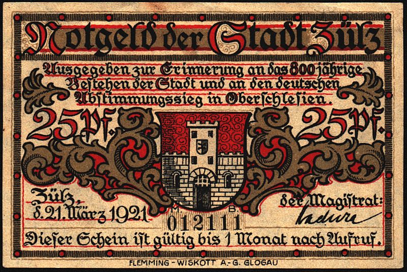 Na awersie u góry napis: Notgeld der Stadt Zűlz, w cetralnej części herb miasta, po bokach symbole nominału 25, poniżej numer serii 012111, informacja o emisji: Zűlz d, 21 März 1921, der Magistrat, nieczytelny podpis. Na rewersie u góry symbole nominału, poniżej rycina przedstawiająca widok miasta i podpis informujący o założeniu miasta: Zűlz, O. Schl. gegrűndel als deutsche Unsiedelung um 1125. Wykonano w głogowskiej drukarni Flemming-Wiskott A.-G. Glogau.