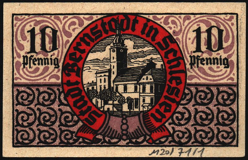 Na awersie w środkowej części herb miasta, z obu stron symbole nominału 10, powyżej napis: Gutschein der Stadt Bernstadt i/Schl, poniżej miejsce wydania: Bernstadt in Schlesien, Der Magistrat, nieczytelny podpis. Na rewersie w środkowej części rycina przedstawiająca zamek w Bierutowie, wokół napis: Stadt Bernstadt in Schlesien, z obu stron symbole nominału 10.