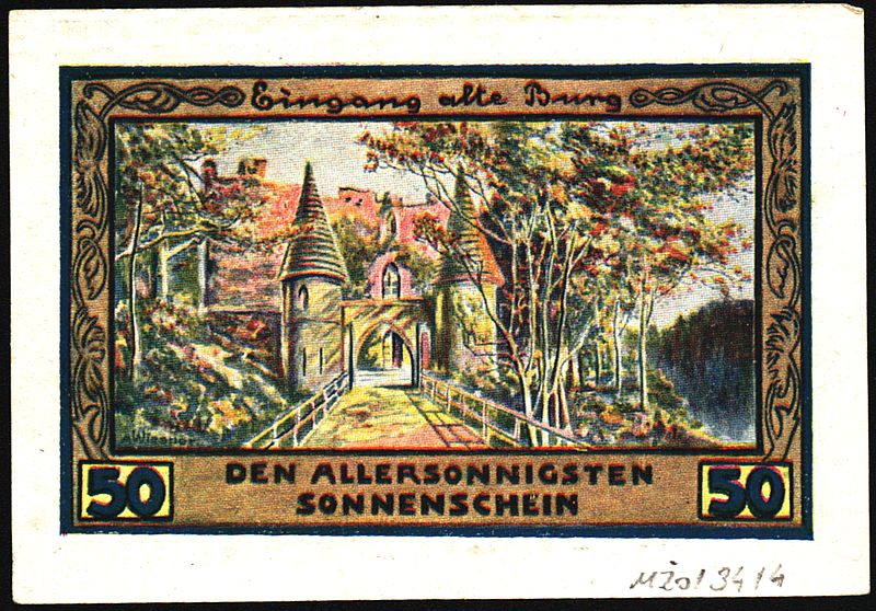 Na awersie w górnej części napis: Bad Kudowa, poniżej w okręgu na fioletowym tle napis: 50 pfennig, poniżej napis: Erstes Herz u. Nerven Heilbad des Ostens, w lewym dolnym rogu numer seryjny. Na rewersie znajduje się rysunek przedstawiający jedno z sanatoriów i źródło Eugeniusza, na jego tle w dolnym lewym rogu symbol nominału 50 pf, powyżej napis: Gesundheit ist Reichtum (Zdrowie to bogactwo). W ramce napis: Eugenquelle Stärkste Eisen Arsenquelle Deutschlands.