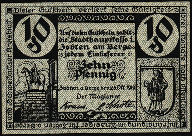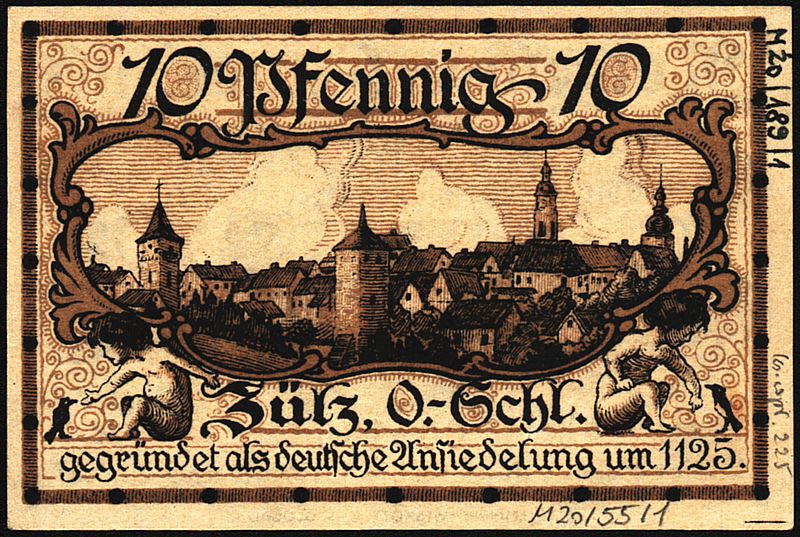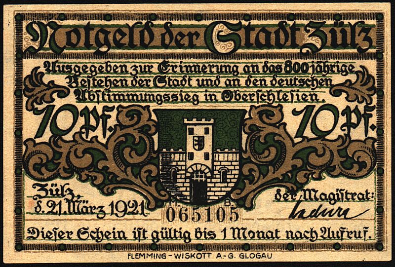 Na awersie u góry napis: Notgeld der Stadt Zűlz, w cetralnej części herb miasta, po bokach symbole nominału 10, poniżej numer serii 065105, informacja o emisji: Zűlz d, 21 März 1921, der Magistrat, nieczytelny podpis. Na rewersie u góry symbole nominału, poniżej rycina przedstawiająca widok miasta i podpis informujący o założeniu miasta: Zűlz, O. Schl. gegrűndel als deutsche Unsiedelung um 1125. Wykonano w głogowskiej drukarni Flemming-Wiskott A.-G. Glogau.