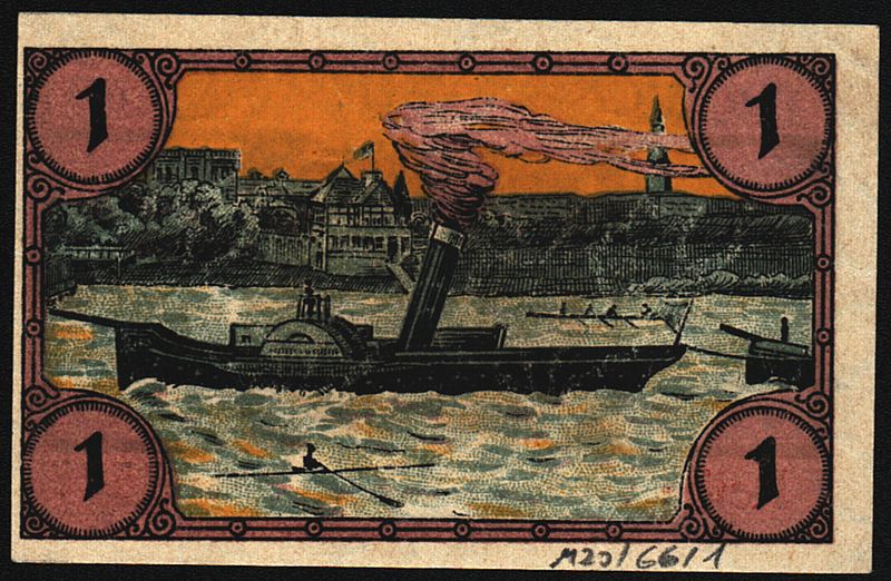 Na awersie w środkowej części symbol nominału 1, po obu stronach ryciny przedstawiające przcujących mężczyzn, powyżej napis: Notgeld der Stadt Glogau. Poniżej informacja o dacie ważności: Gűltig bis 31. Dezember 1920 i numer seryjny: Reihe V nr 107507. Na rewersie rycina przedstawiająca płynący parowiec, w rogu symbol nominału 1. Wykonano w drukarni: Carl Flemming AG. Glogau u. Berlin.