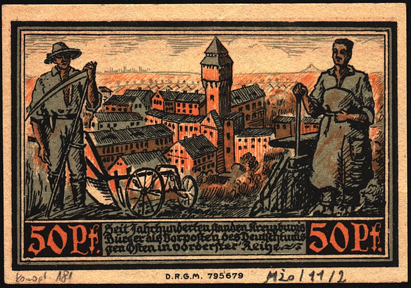 Na awersie w środkowej części herb miasta, powyżej napis: Kreuzburg in Oberschlesien, poniżej data emisji: Kreuzburg O/S, den 18 october 1921, Magistrat, podpis nieczytelny, w dolnych rogach napis: 50 pfennig. Całość otoczona ramką u dołu nazwa głogowskiej drukarni: Flemming-Wiskott A.-G. Glogau. Na rewersie znajduje się rysunek przedstawiający panoramę miasta, po bokach dwie stojące postacie męskie poniżej nich symbol nominału 50 pf.