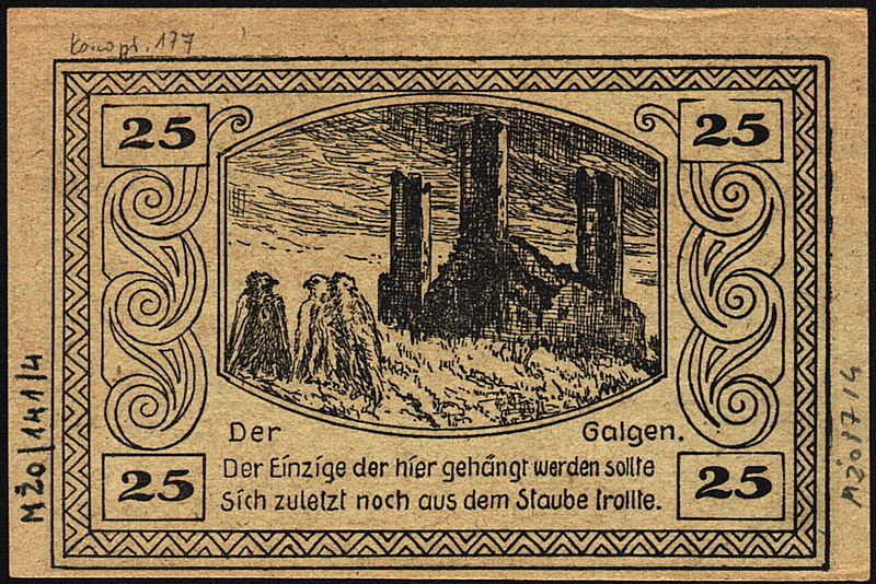 Na awersie napis: Stadt Spar Kasse Stadt Canth (Miejska Kasa Oszczędnościowa, Miasto Kąty Wrocławskie), w centralnej części herb miasta, w rogach symbole nominałów 25. W centralnej części rewersu rycina przedstawiająca wzgórze straceń, ruiny zamku, pod spodem napis: Der Galgen. Der Einzige der hier gehängt werden sollte Sich zuletzt noch aus dem Staube Irollte. Po bokach elementy dekoracyjne, w rogach symbole nominałów 25. Całość otoczona ramką z ornamentem.