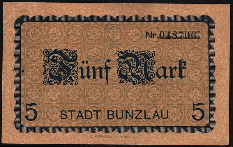 Na awersie w prawym górnym rogu numer serii 048706, w środkowej części duży napis: Fűnf Mark, poniżej w rogach symbole nominału 5 i miejsce wydania: Stadt Bunzlau. Na rewersie w środkowej części napis: Fűnf Mark, powyżej herb miasta, po obu stronach informacja o ważności banknotu: Gűltig bis 1 Dezember 1919. Wykonano w bolesławieckiej drukarni L. Fembach, Bunzlau.