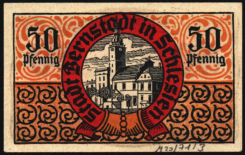 Na awersie w środkowej części herb miasta, z obu stron symbole nominału 50, powyżej napis: Gutschein der Stadt Bernstadt i/Schl, poniżej miejsce wydania: Bernstadt in Schlesien, Der Magistrat, nieczytelny podpis. Na rewersie w środkowej części rycina przedstawiająca zamek w Bierutowie, wokół napis: Stadt Bernstadt in Schlesien, z obu stron symbole nominału 50.