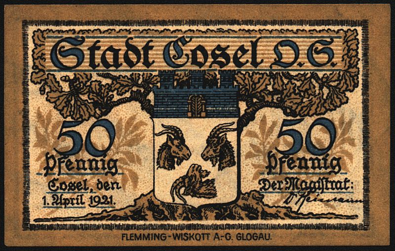 Na awersie w górnej części napis: Stadt Cosel O.S., w centralnej części herb Koźla z lewego boków napis: 50 pfennig Cosel, den 1 april 1921, po prawej stronie napis: 50 pfennig Der Magistrat oraz nieczytelny podpis. Całość otoczona ramką u dołu nazwa głogowskiej drukarni: Flemming-Wiskott A.-G. Glogau. W centralnej części rewersu rycina przedstawiająca odrę i nabrzeża. W góry napis: Herauzgegeben zur Grinnerung an die Ubsstimmung 20 marz 1921, po bokach symbol nominału 50 pf., poniżej napis informujący o terminie ważności: Gűltig bis 1 monat nach Zekanntmachung.