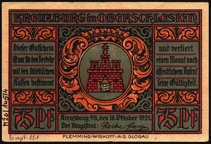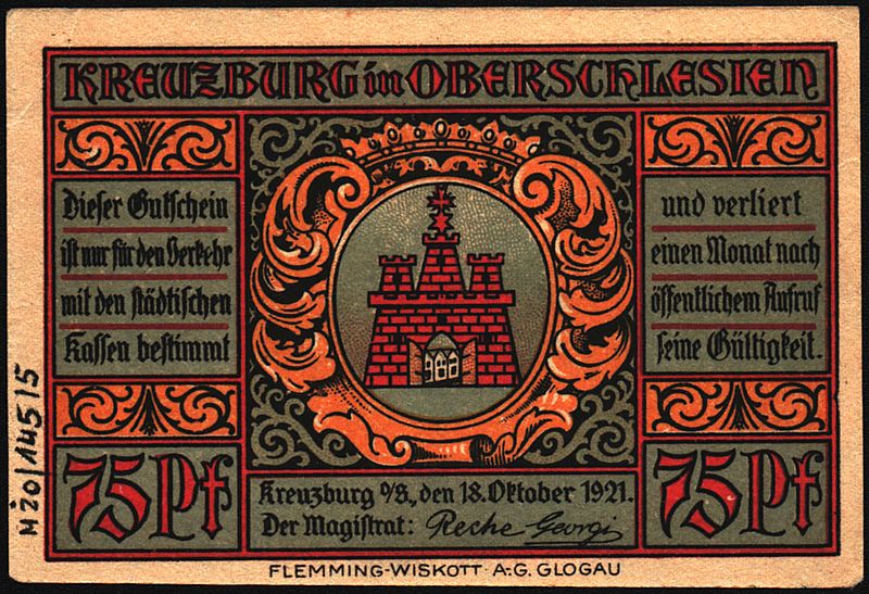 Na awersie w środkowej części herb miasta, powyżej napis: Kreuzburg in Oberschlesien, poniżej data emisji: Kreuzburg O/S, den 18 october 1921, Magistrat, podpis nieczytelny, w dolnych rogach napis: 75 pfennig. Całość otoczona ramką u dołu nazwa głogowskiej drukarni: Flemming-Wiskott A.-G. Glogau. Na rewersie w łuku rysunek przedstawiający stare miasto, w górnych rogach symbol nominału 75 pf.