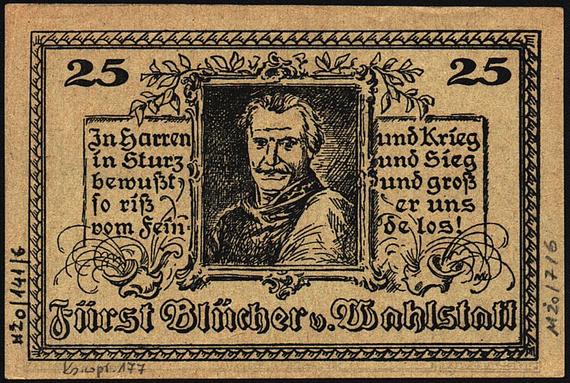Na awersie napis: Stadt Spar Kasse Stadt Canth (Miejska Kasa Oszczędnościowa, Miasto Kąty Wrocławskie), w centralnej części herb miasta, w rogach symbole nominałów 25. W centralnej części rewersu rycina przedstawiająca portret mężczyzny, w tle napisy, pod spodem napis: Fűrst Blűcher v. Wahlstall. W rogach symbole nominałów 25, całość otoczona ramką z ornamentem.