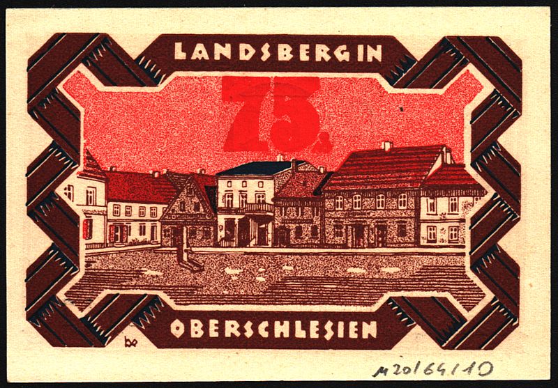 Na awersie w środkowej herb miasta otoczony napisem: Stadt Landsberg O/S 1241, poniżej informacja o dacie ważności: 1 März 1922 oraz wynikach plebiscytu: Landsberg O/S am 20 März 1921 Volksabstimmung: 93% Deutsch. W górnych rogach symbole nominału 75, poniżej słupy graniczne, w dolnym prawym rogu numer serii 06819. Na rewersie rycina przedstawiająca fragment miasta, zabudowania, nad nimi symbol nominału 75 oraz napis: Landsbergin Oberschlesien.