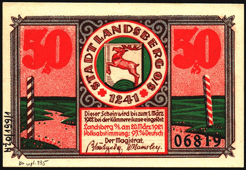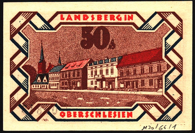 Na awersie w środkowej herb miasta otoczony napisem: Stadt Landsberg O/S 1241, poniżej informacja o dacie ważności: 1 März 1922 oraz wynikach plebiscytu: Landsberg O/S am 20 März 1921 Volksabstimmung: 93% Deutsch. W górnych rogach symbole nominału 50, poniżej słupy graniczne, w dolnym prawym rogu numer serii 06819. Na rewersie rycina przedstawiająca fragment maista, zabudowania, nad nimi symbol nominału 50 oraz napis: Landsbergin Oberschlesien.