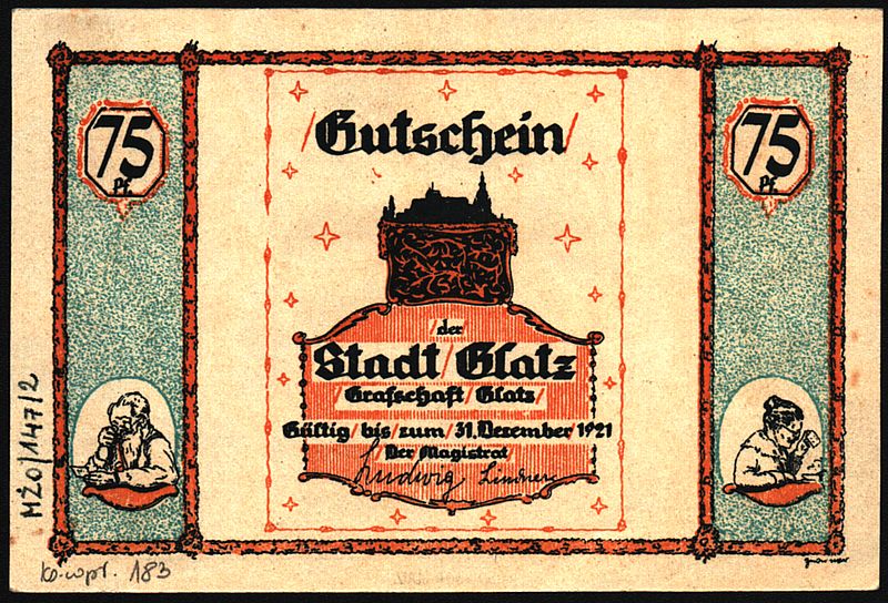 Na określenie pieniędzy namiastkowych używano także terminu „kupony”. Na awersie w górnej części napis: Gutschein, poniżej miniatura panoramy miasta i napis: der Stadt Glatz, Grafschaft Glatz, Gűltig bis zum 31 Dezember 1921, Der Magistrat. Nieczytelne podpisy. W górnych rogach symbol nominału 75 pf. Na rewersie w środkowej części zapis nutowy pieśni ludowej i napis: Glatzer Volksliedlein. W obu górnych rogach symbol nominału 100 pf.