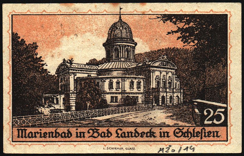 Na awersie w górnym lewym rogu napis: Stadt Landeck in Schlesien, w prawym górnym rogu numer seryjny. W środkowej części duży symbol nominału 25, po bokach napis, po lewej stronie: Landeck i. Schles. 11 märz 1921, po prawej stronie: Der Magistrat oraz nieczytelny podpis. Na rewersie ilustracja przedstawiająca budynek z zdroju, poniżej napis: Marienbad in Bad Landbeck in Schlesien. W prawym dolnym rogu symbol nominału 25.